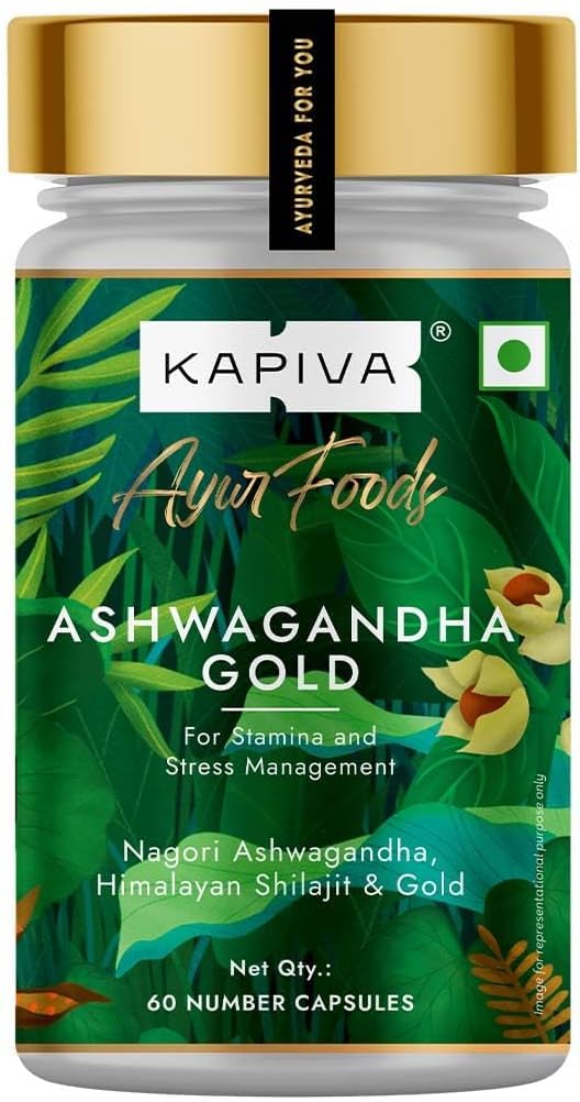 Kapiva Ashwagandha Gold Capsules, 183rd Day Harvested Potent Nagori Ashwagandha With Gold, Shilajit | Helps In Stress Management, Improve Energy & Stamina | For Unisex, 60 Capsules 100gm 0.2lbs