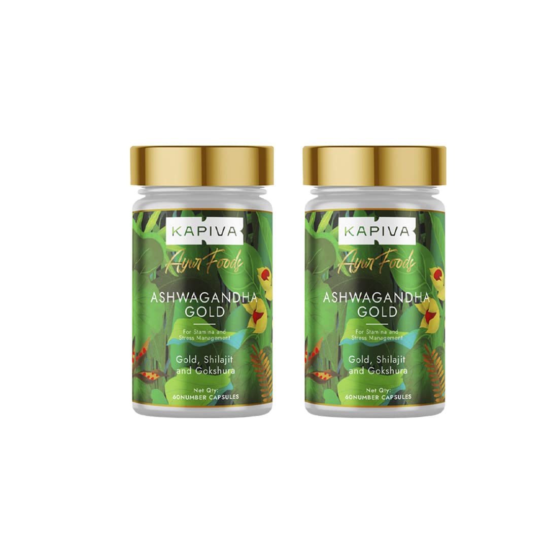 Kapiva Ashwagandha Gold Capsules, 183rd Day Harvested Potent Nagori Ashwagandha With Shilajit | Helps In Stress Management, Improve Energy | For Unisex, 60 Capsules 100gm 0.2lbs Each Pack Of 2