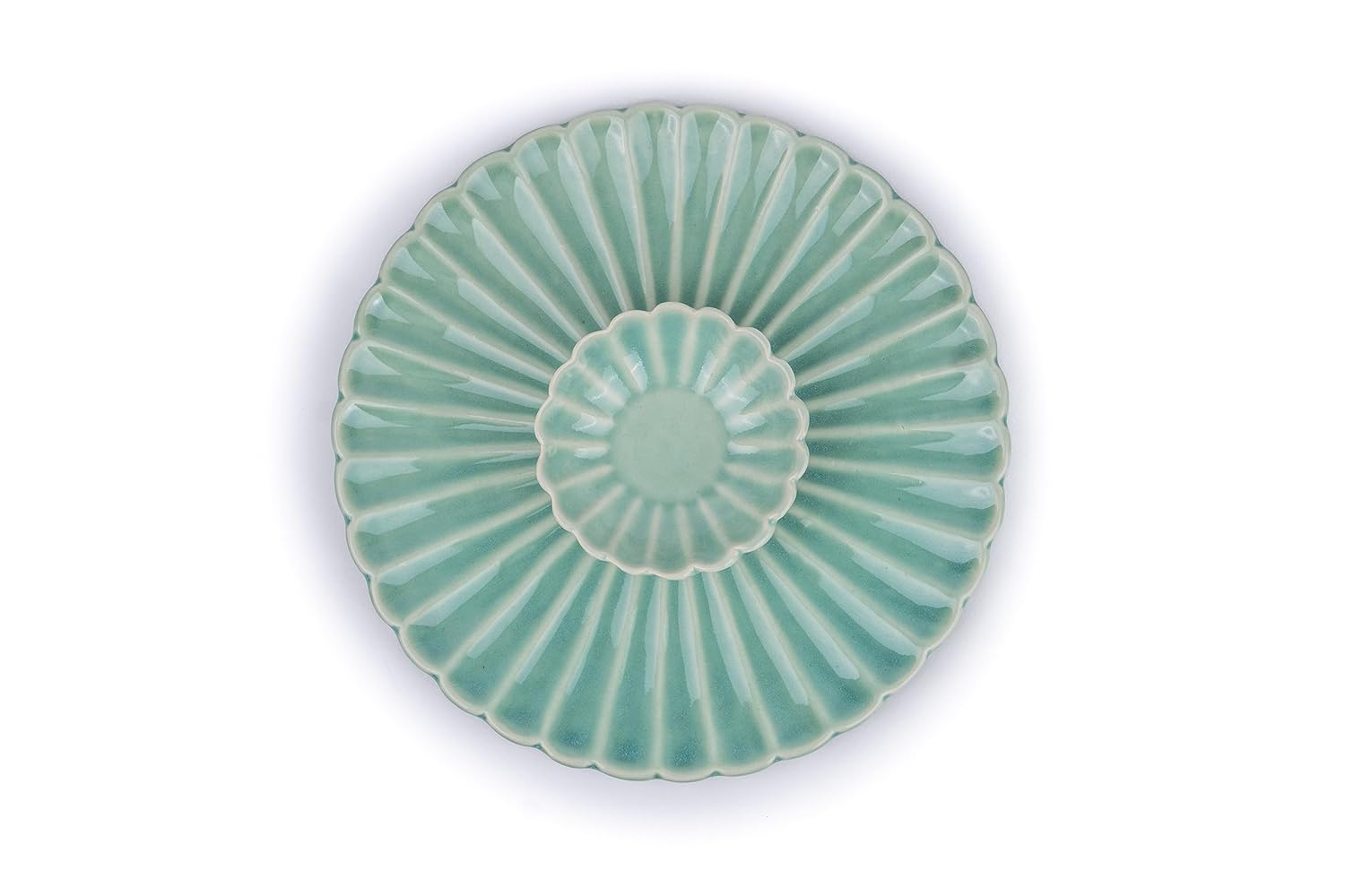 Large Flower Ceramic Serving Platter With Dip, 75ml - Light Mint | Serving Plate With Glossy Finish | Platters Serving Set | Snacks Serving Plates | Ceramic Flower Platter + Dip