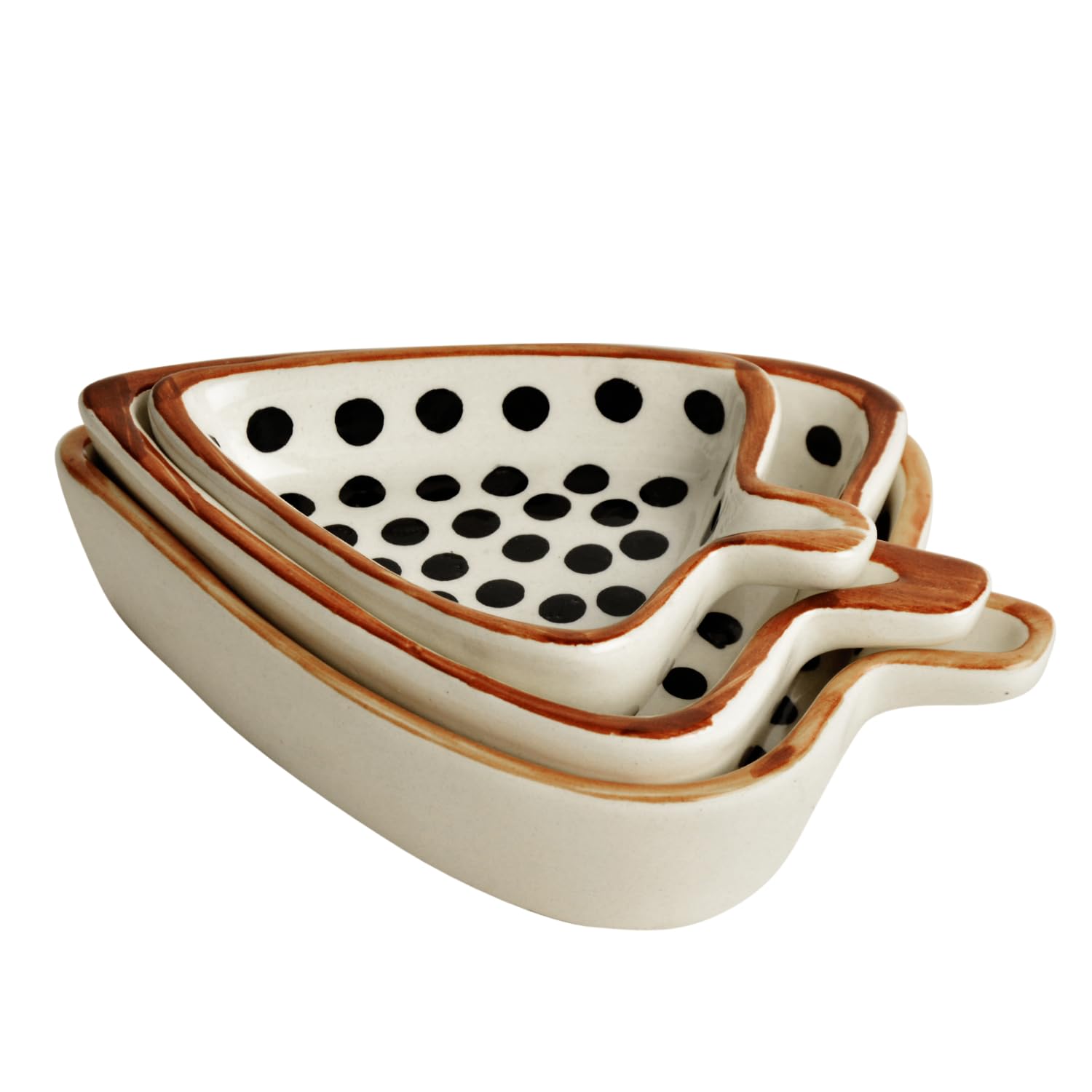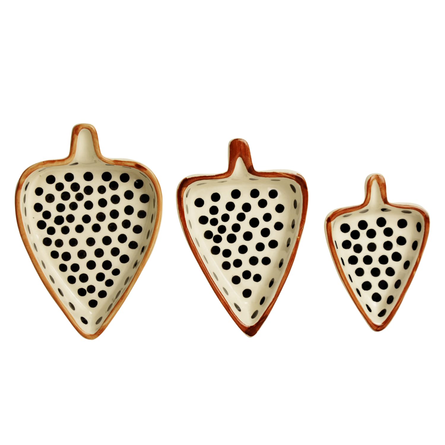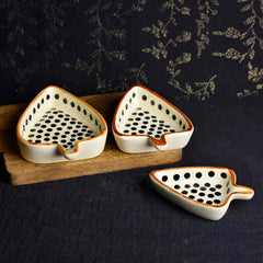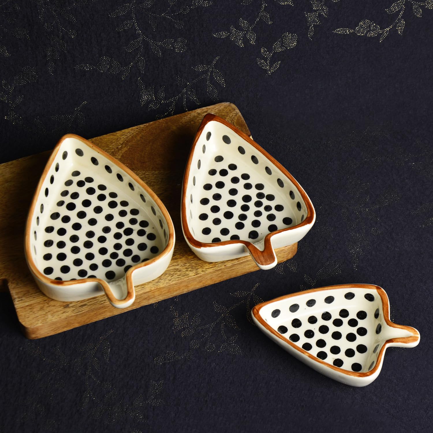 Leaf Shaped Hand Painted Ceramic Glossy Tray Set Of 3, White, Black Dots | For Serving Cookies, Dry Fruits, Sweets & Snacks, Length – 16 Cm, 15 Cm & 12 Cm | Small Platter Set