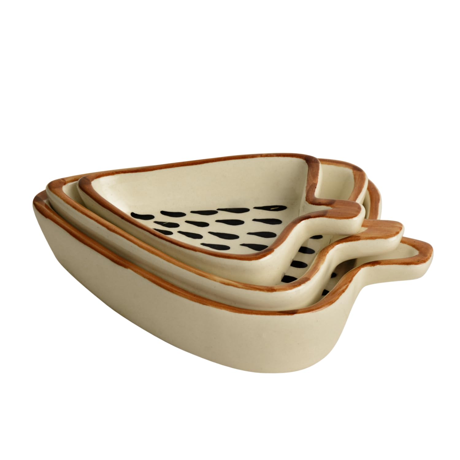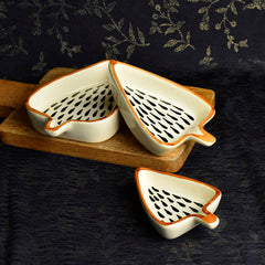 Leaf Shaped Hand Painted Ceramic Glossy Tray Set Of 3 - White, Black Rain Drops | For Serving Cookies, Dry Fruits, Sweets & Snacks, Length – 16 Cm, 15 Cm & 12 Cm | Small Platter Set