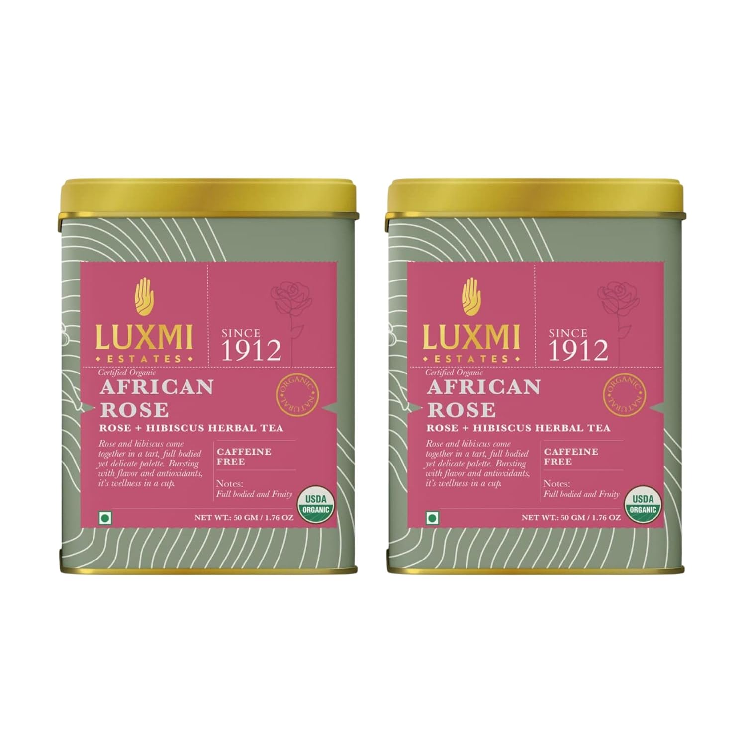 Luxmi Estates African Rose + Hibiscus Herbal Tea Pack Of 2 - 50gm Tin, 1.7 Ounce | USDA Certified Organic Tea - Caffeine Free Herbal Tea Bags | Rich In Antioxidants, Additives Free