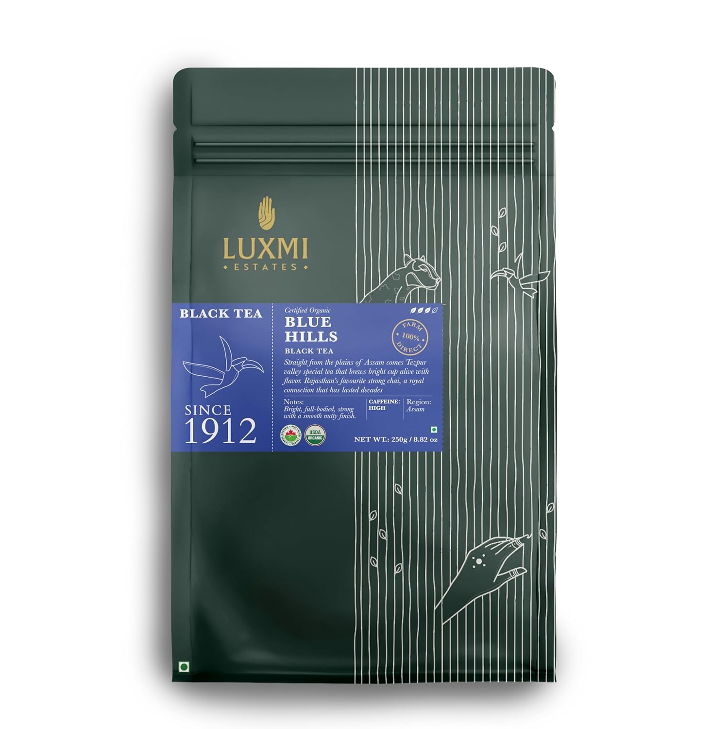 Luxmi Estates Blue Hills Black Tea - 250gm, 8.8 Ounce, 125 Cups | Premium CTC Blended Tea With Leaf - Strong Assam Flavor | Additives Free, High Caffeine Black Tea