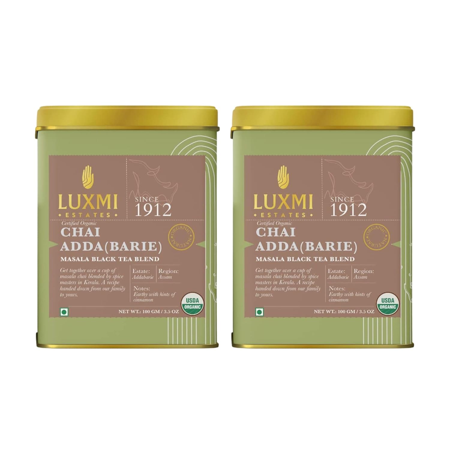 Luxmi Estates Chai Adda Barie Black Tea Pack Of 2 - 100gm Tin, 3.5 Ounce Each | USDA Certified Organic Masala Black Tea Blend - Indian Spice Chai Enriched With Cinnamon & Cardamom