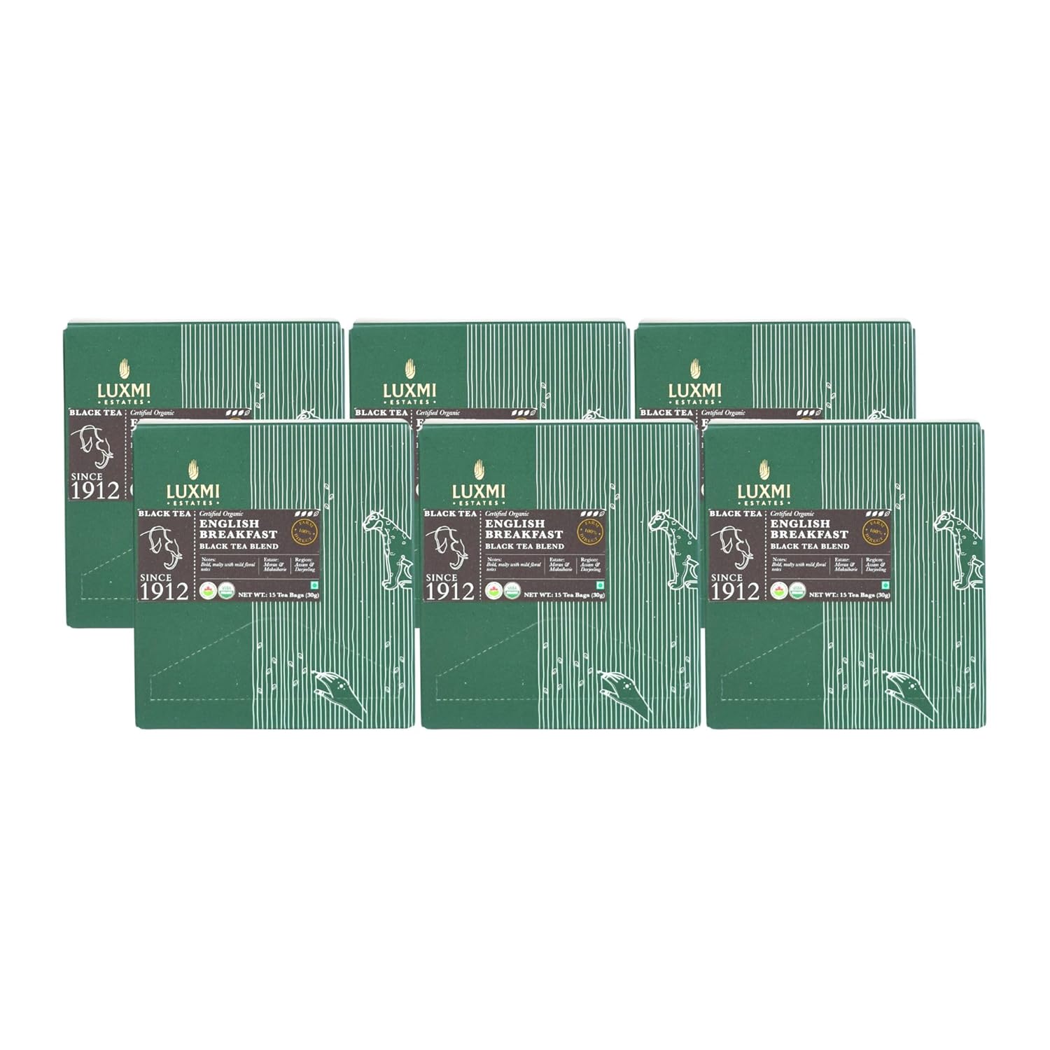 Luxmi Estates English Breakfast Black Tea Blend Pack Of 6 - 30gm, 1.05 Ounce, 15 Tea Bags Each | USDA Organic Certified Tea - Darjeeling & Assam Tea | Smooth, Flavorful, Robust, Caffeinated Black Tea