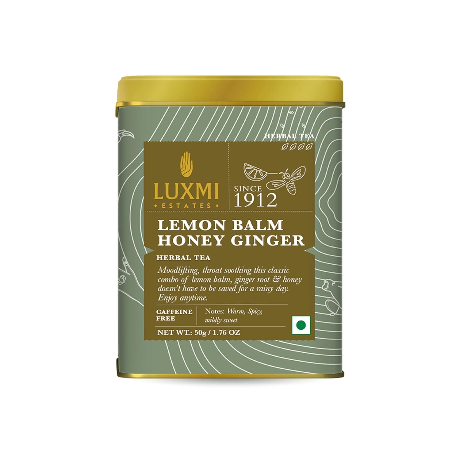 Luxmi Estates Lemon Balm Honey Ginger Herbal Tea - 50gm Tin Caddy, 1.7 Ounce, 25 Cups | USDA Certified Organic Herbal Tea - Caffeine Free Herbal Tea | Rich In Antioxidants, Additives Free