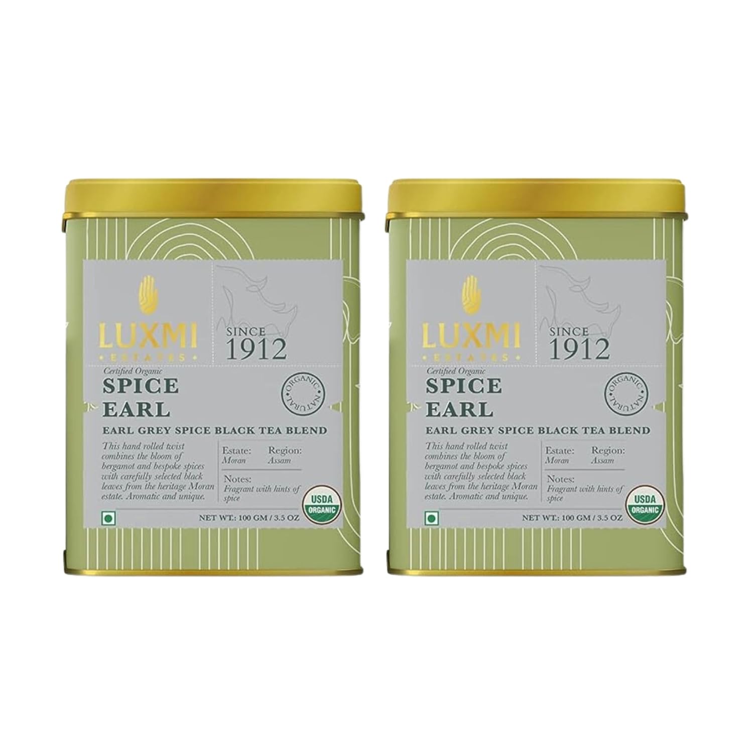 Luxmi Estates Spice Earl Grey Black Tea Blend Pack Of 2 - 100gm Tin, 3.5 Ounce Each | USDA Certified Organic Tea - Caffeinated Herbal Tea | Made With Cinnamon, Cardamom, Cloves, Black Pepper