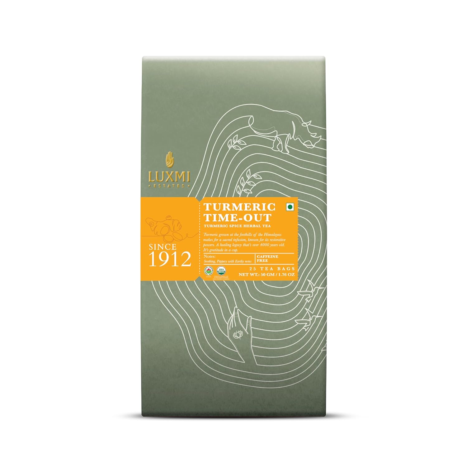 Luxmi Estates Turmeric Timeout Spice Herbal Tea - 50gm, 1.7 Ounce, 25 Tea Bags | USDA Certified Organic Herbal Tea - Caffeine Free Herbal Tea | Made With Turmeric, Ginger, Cardamom, Black Pepper