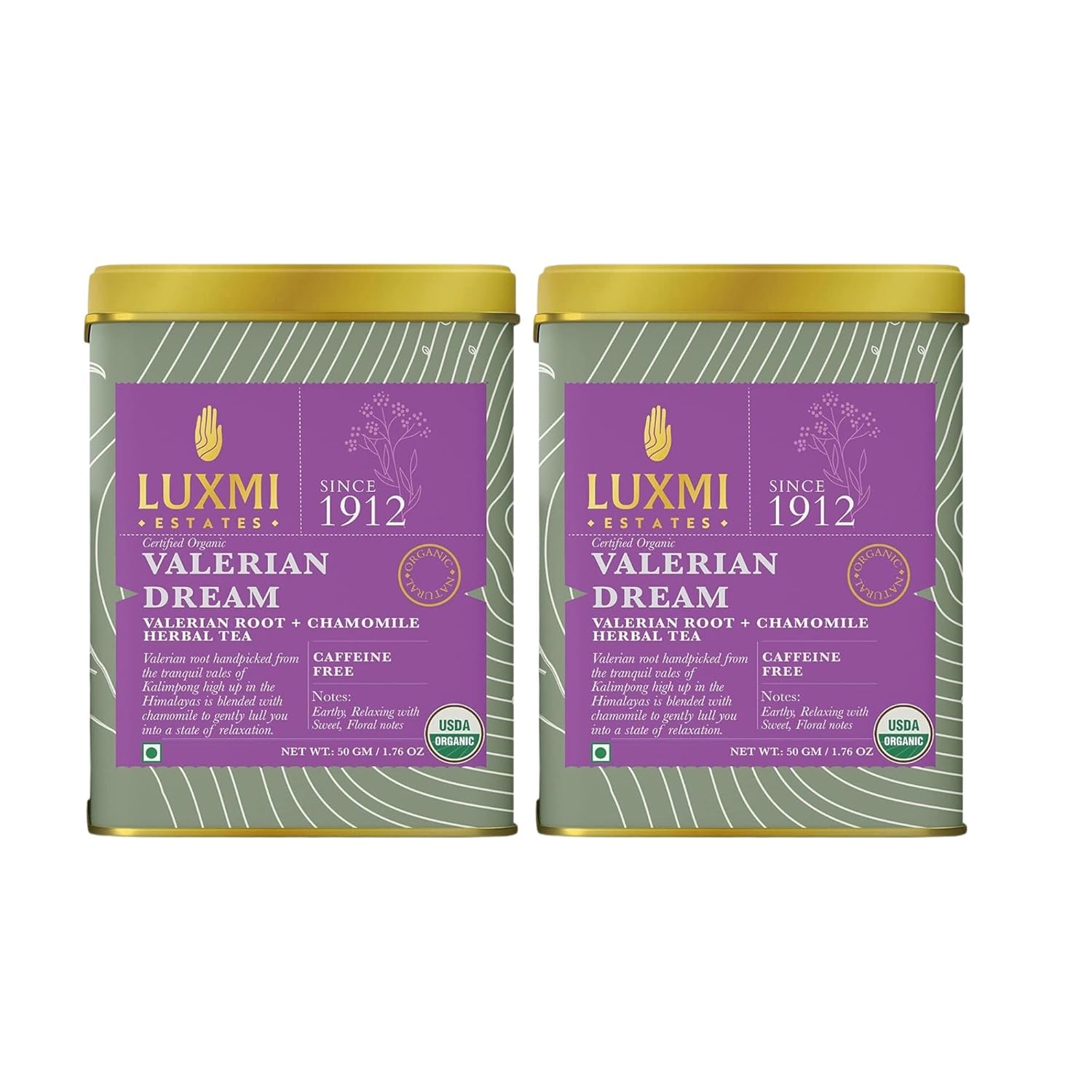 Luxmi Estates Valerian Dream Herbal Tea Pack Of 2 - 50gm Tin, 1.7 Ounce, 25 Cups Each | USDA Certified Organic Valerian Root + Chamomile Herbal Tea - Gluten Free, Caffeine Free Tea Bags