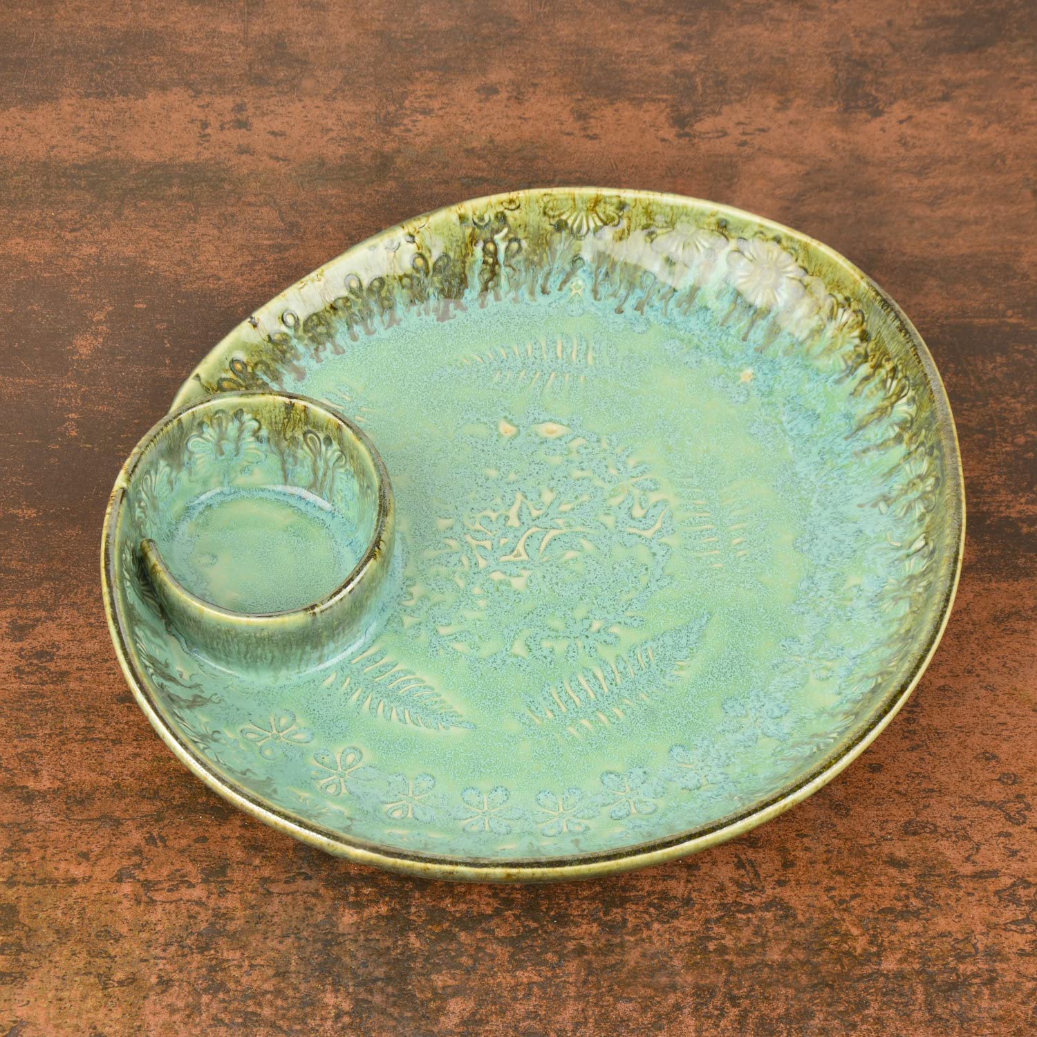 Luxurious Hand Embossed Ceramic Chip & Dip Platter With Fixed Dip Bowl - Turquoise Green, 11 Inches, 1300 Gm | Starter Serving Platter | Kebab Platter