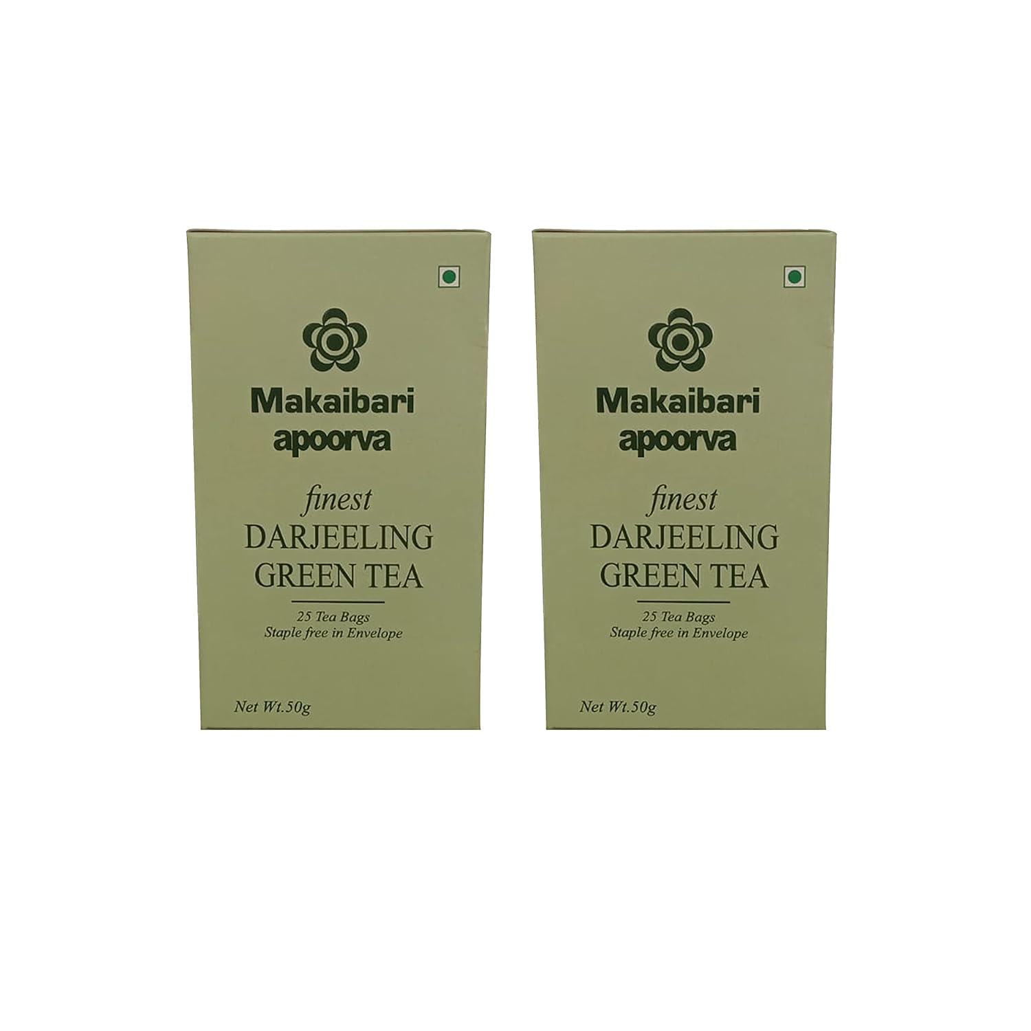 Makaibari Apoorva Finest Darjeeling Green Tea - Pack Of 2 X 50gm, 1.7 Ounce, 25 Tea Bags | Darjeeling Loose Leaf Green Tea - USDA Organic Certified Tea | Low Caffeine - Antioxidants, Immunity Booster