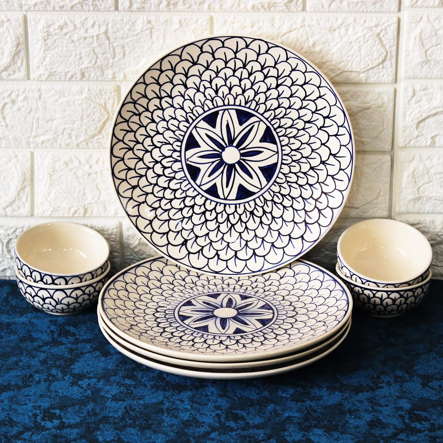 Mermaid Tales Hand Painted Ceramic Dinner Set - 8 Piece, White & Indigo | 4 Dinner Plates + 4 Katori Serving Bowls, 180ml Each | Serving For 4, Microwave Safe & Dishwasher Safe