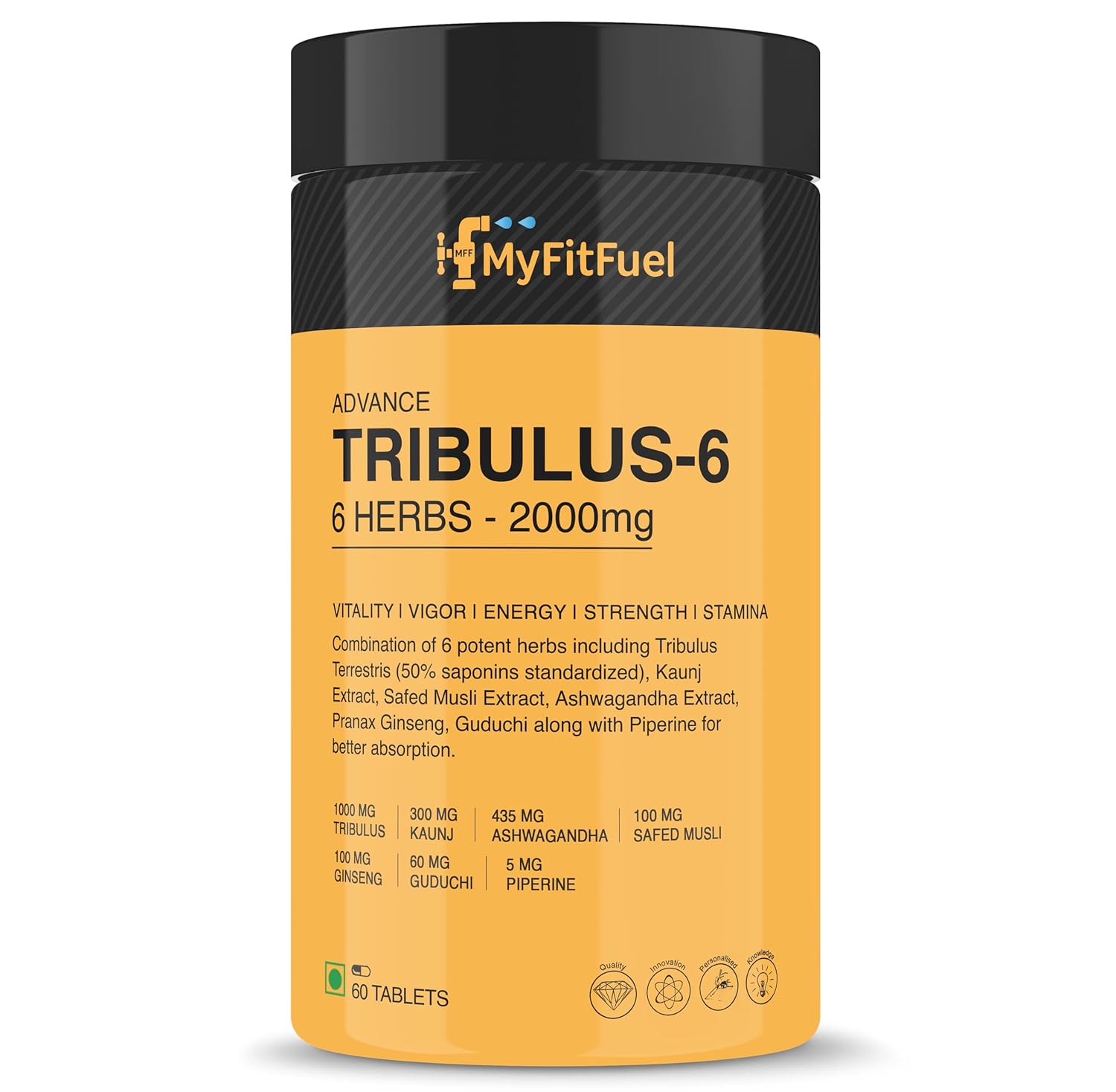 Myfitfuel Tribulus Terrestris +6 Herbs 2000mg Gokshura 50% Saponins, Ginseng, Kaunj, Safed Musli, Ashwagandha, Guduchi & Piperine 95% For Performance, Muscle & Energy | 60 Tablets 100gm 0.2lbs