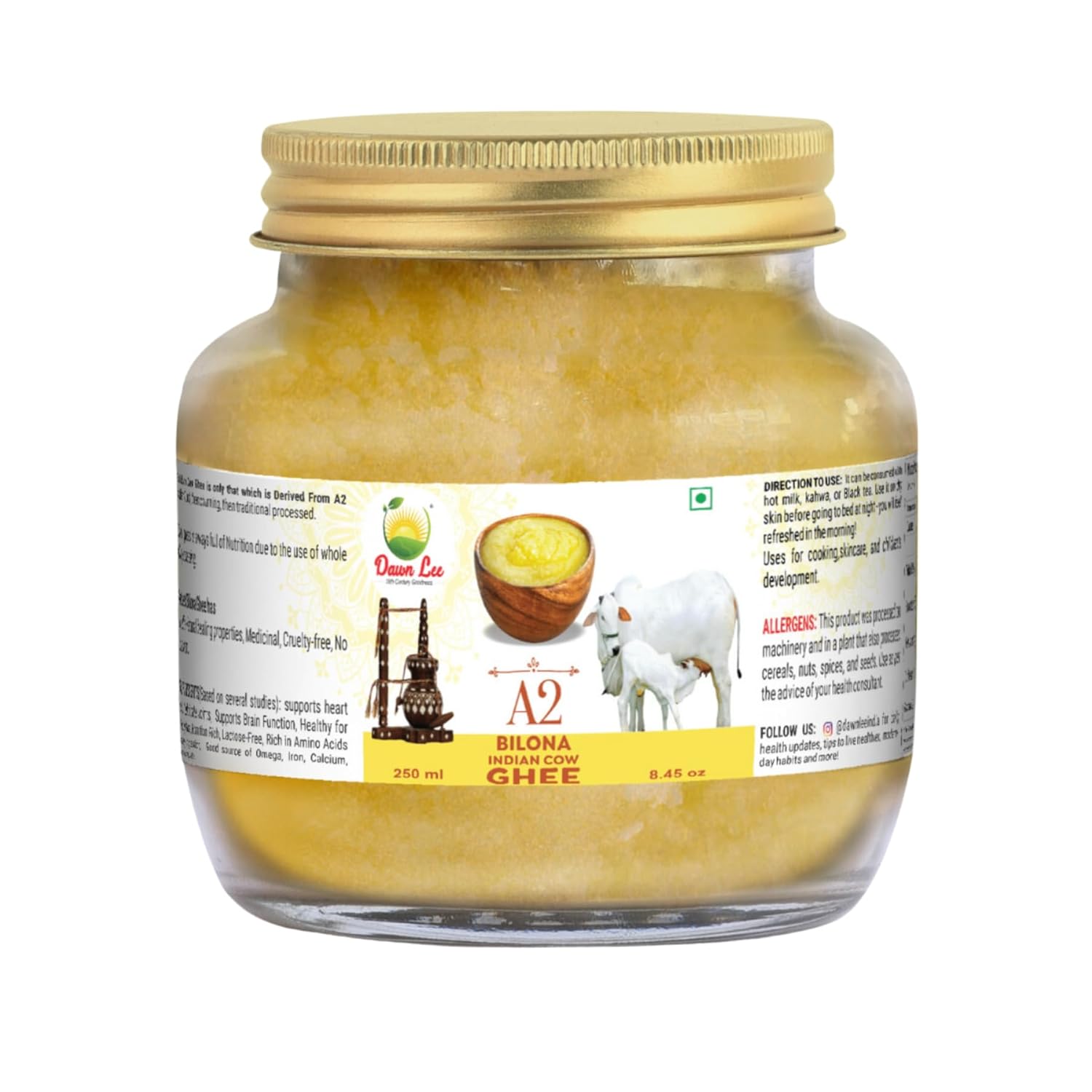 Natural Premium A2 Bilona Indian Cow Ghee By Dawn Lee | High In Fiber Healthy & Nutritious Handmade A2 Bilona Ghee Good For Eyes | (250ml) 8.4 Ounce | Jar Pack