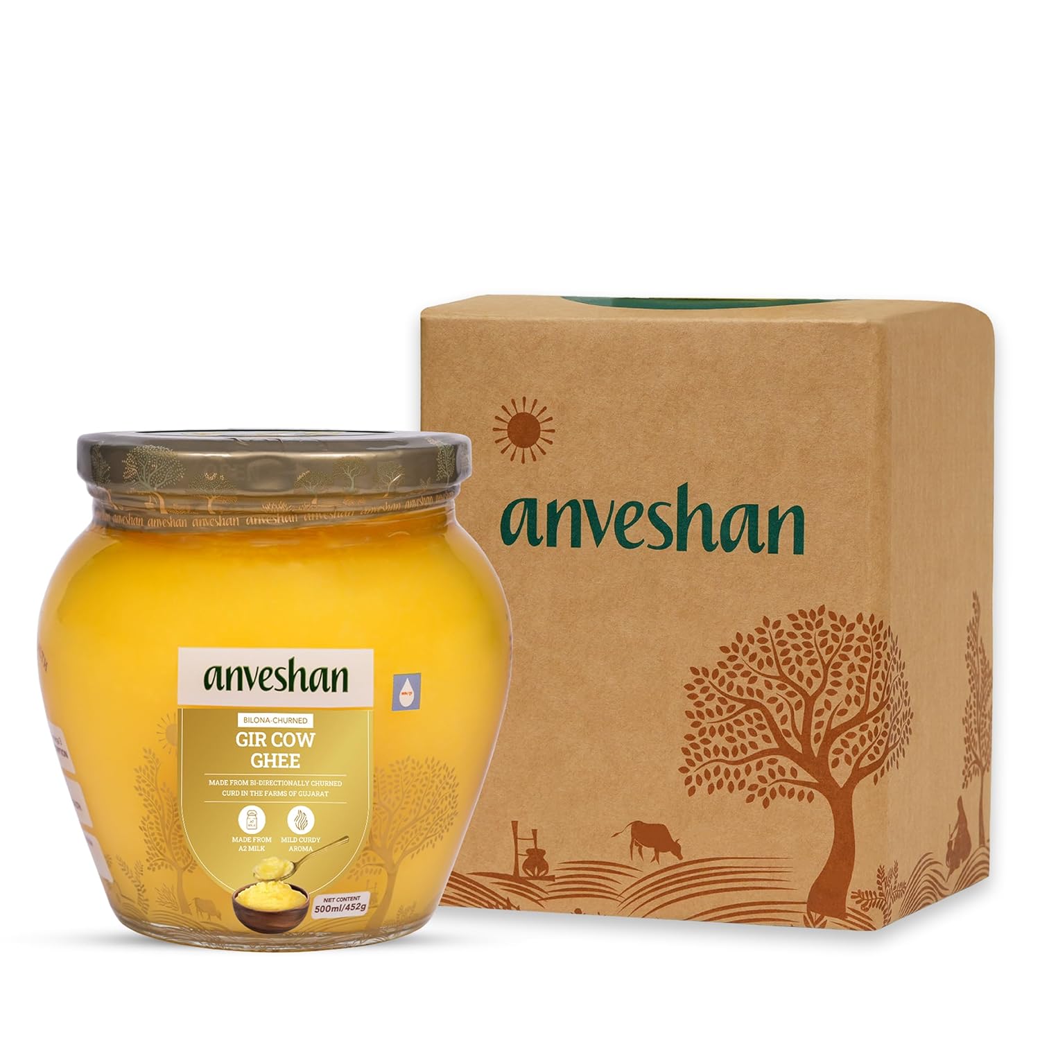 Natural Premium Bilona-Churned Gir Cow Ghee By Anveshan | High In Vitamins A, D & Healthy Bilona Method Desi Ghee Good For Digestive Health | (500ml) 16.9 Ounce | Jar Pack