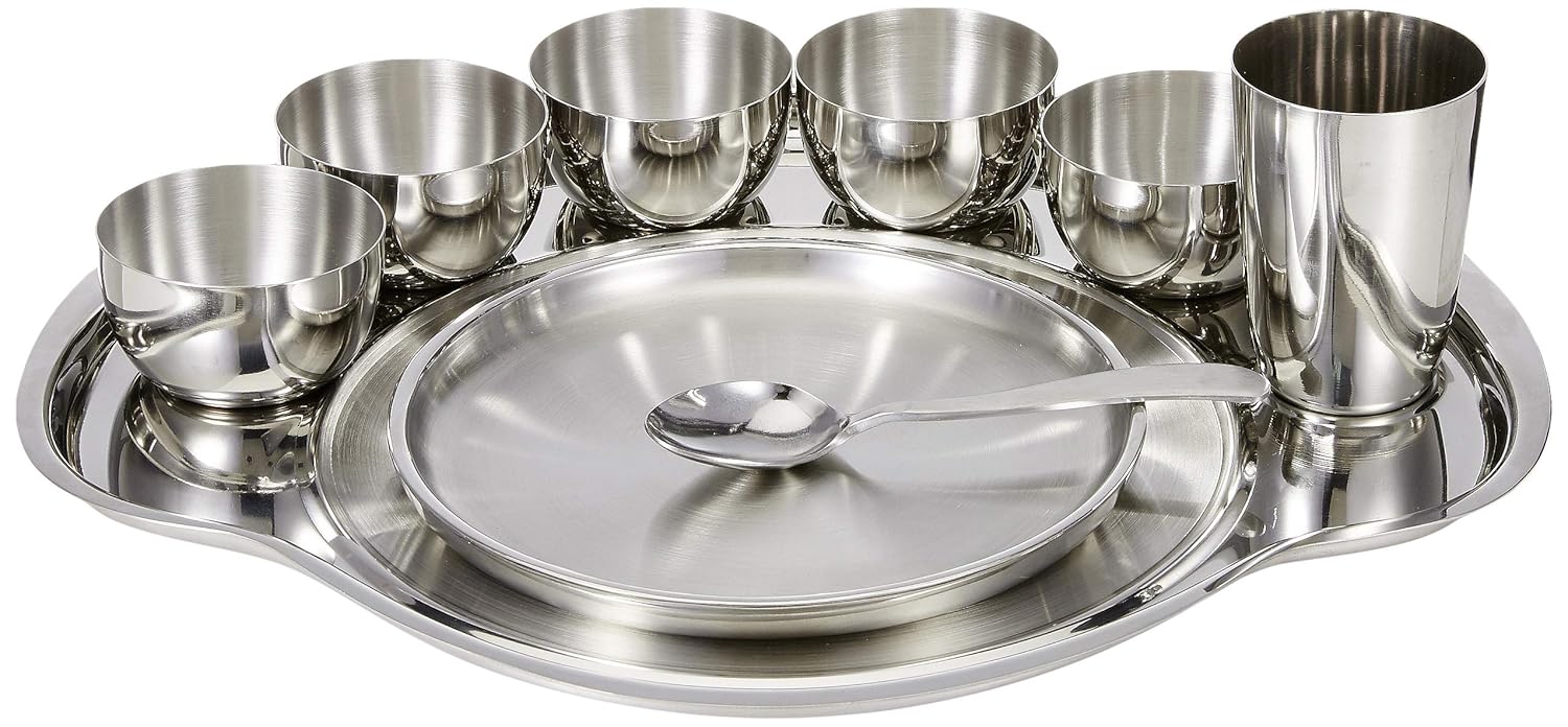 Nifty Stainless Steel Thali Set - 9 Pieces, Silver | 5 Katoris+ 1 Glass+ 1 Quarter Plate+ 1 Full Plate+ 1 Dessert Spoon