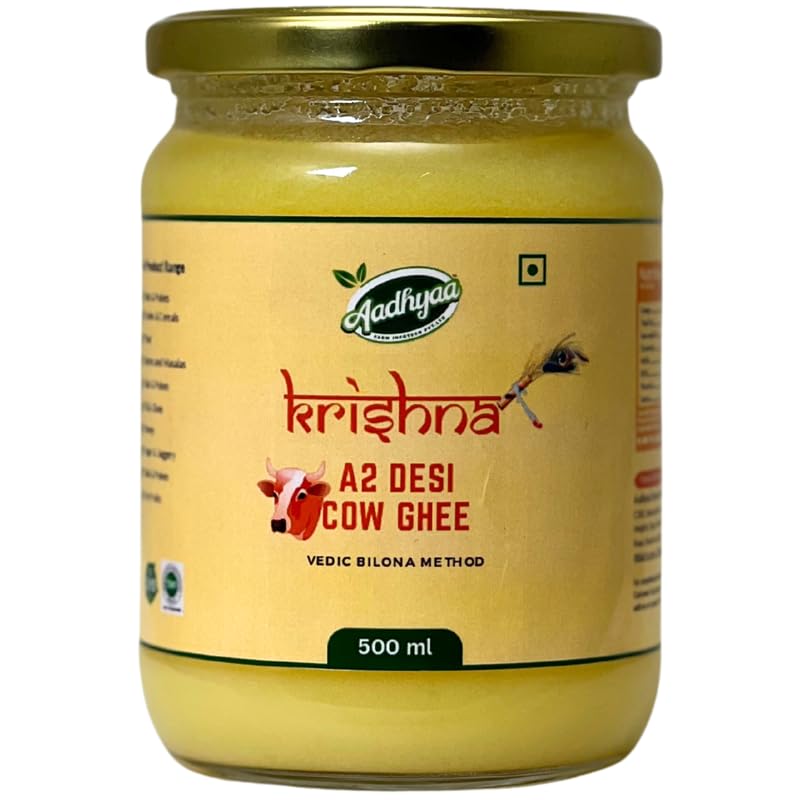 Organic Krishna A2 Desi Cow Ghee By Aadhyaa | Vedic Bilona Method Hand Churned Cultured Ghee Good For Boost Energy | (500ml) 16.9 Ounce | Jar Pack