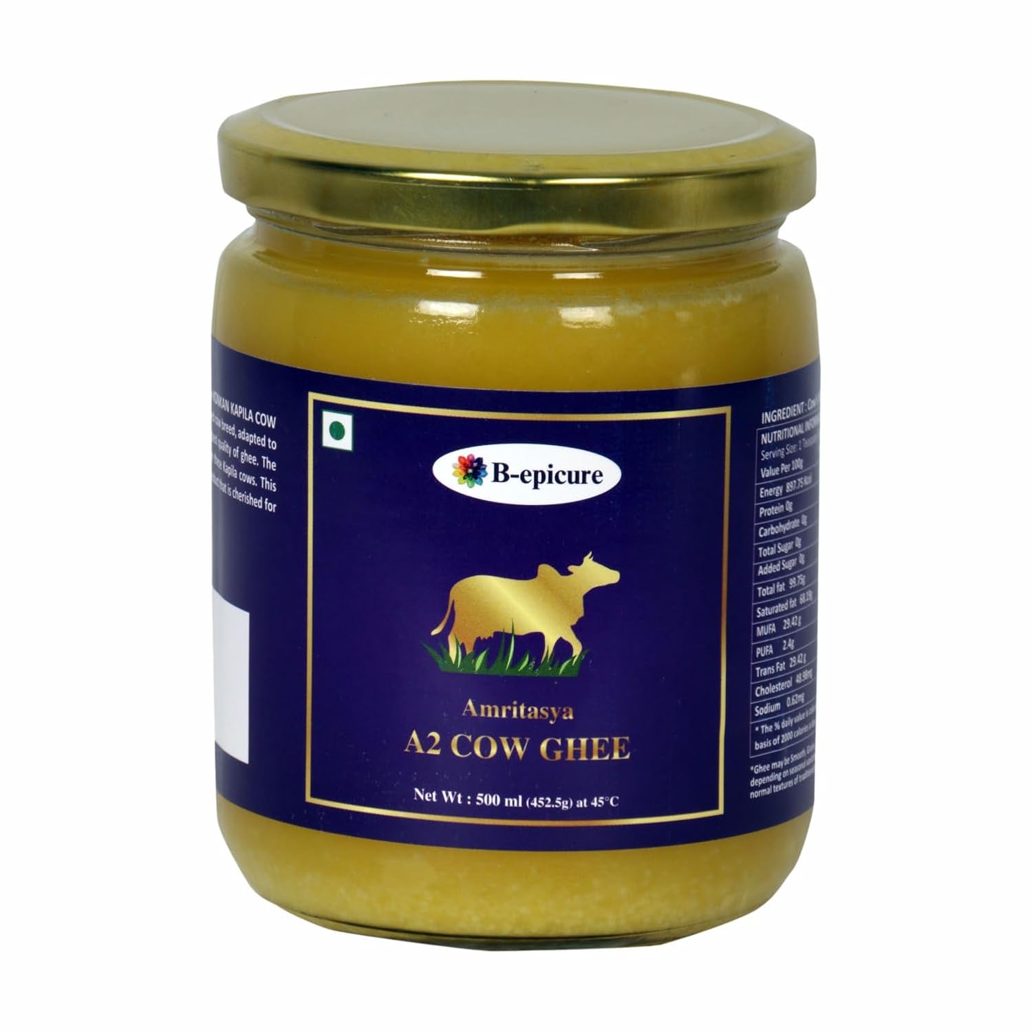 Organic Pure Amritasya A2 Cow Ghee By B-Epicure | Traditional Bilona Method Pure & Natural Curd- Churned Desi Ghee Good For Glowing Skin | (500ml) 16.9 Ounce | Jar Pack