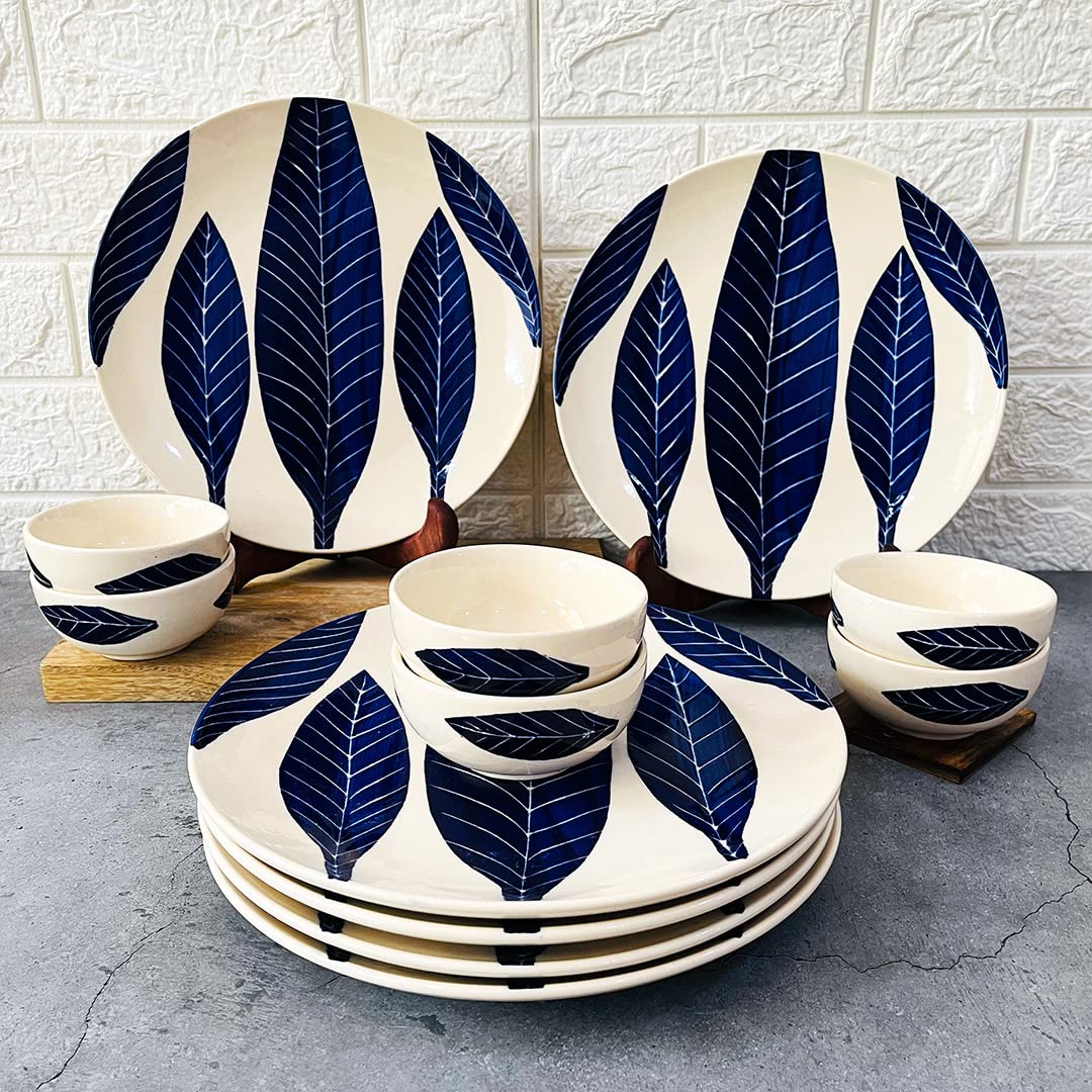 Patram Hand Painted Ceramic Dinner Set - 12 Pieces, White & Blue | 6 Dinner Plates + 6 Katori Bowls, 180ml Each Dinnerware Set | Serving For 6, Microwave Safe