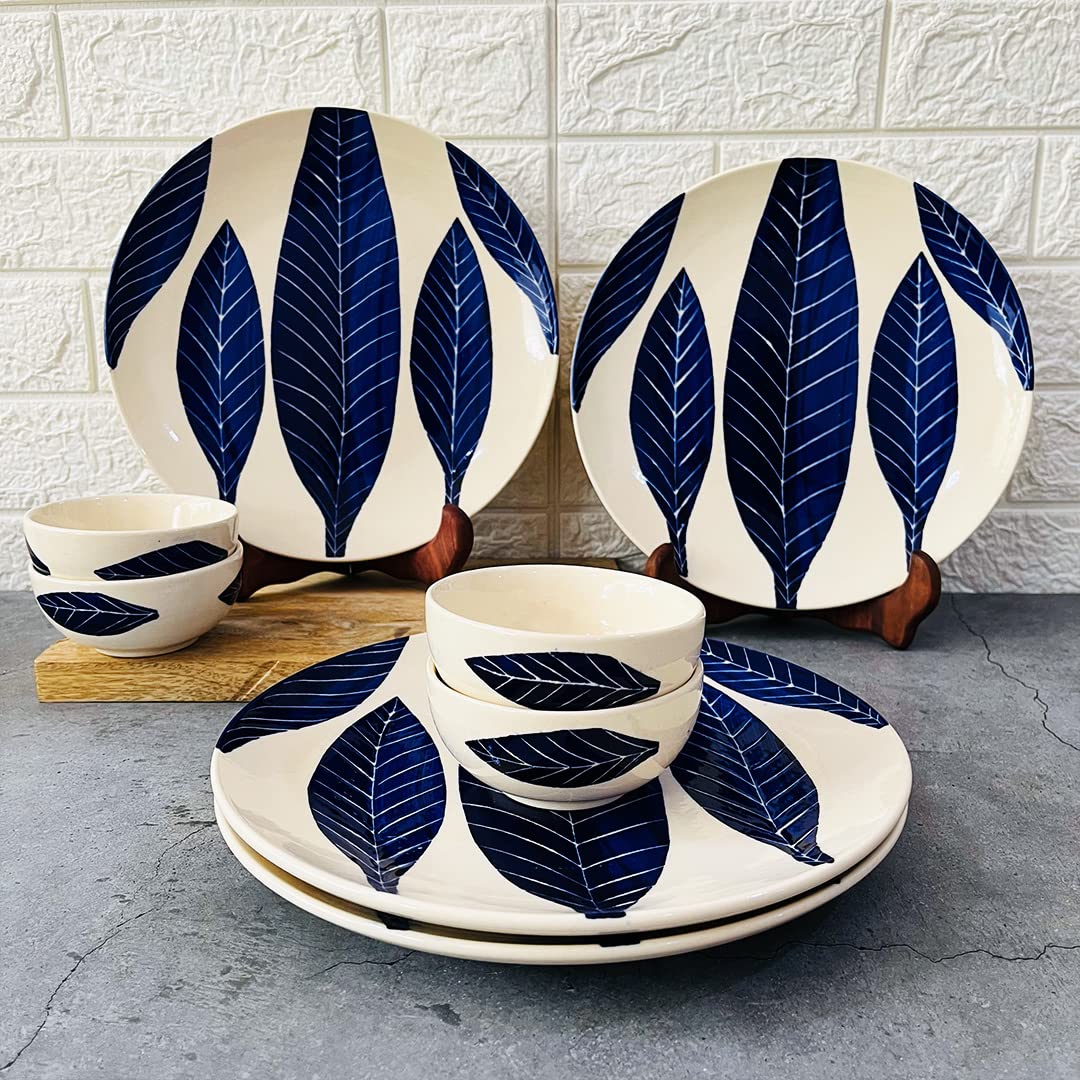 Patram Hand Painted Ceramic Dinner Set - 8 Pieces, White & Blue | 4 Dinner Plates + 4 Katori Bowls, 180ml Each Dinnerware Set | Serving For 4, Microwave Safe & Dishwasher Safe