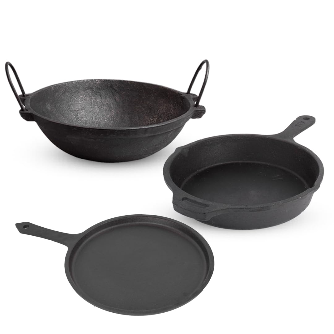 Pre-seasoned Black Cast Iron Cookware Set | Kadai 24.7 Cm, 2 Liters + Tawa 26 Cm + Fry Pan 25 Cm, 1.6 Liters | Kitchen Cooking Combo Pots & Pans Set Of 3 Pcs | Naturally Nonstick