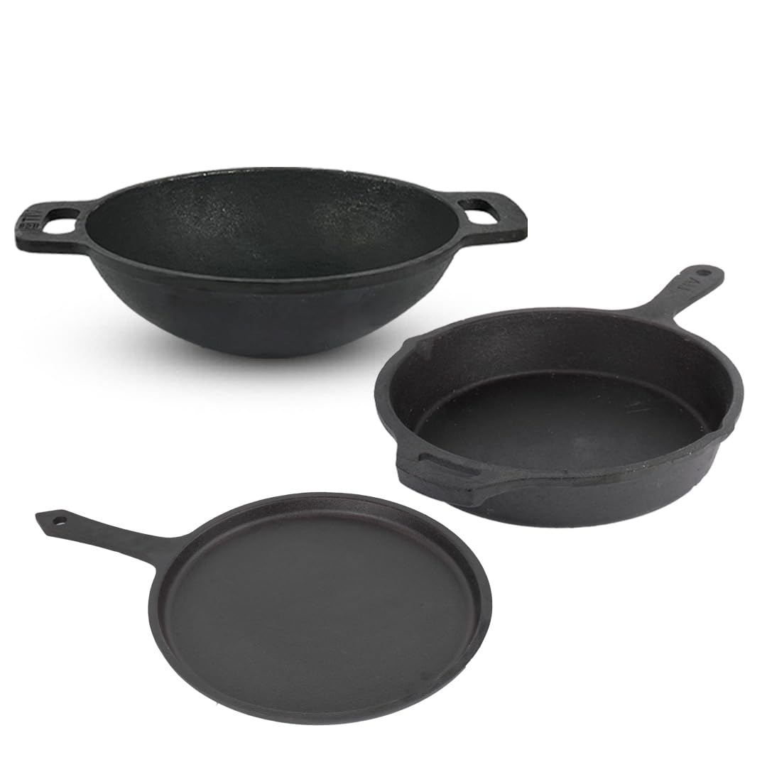 Pre-seasoned Black Cast Iron Cookware Set | Tawa 25.7 Cm + Kadai 25.6 Cm, 2.4 Liters + Fry Pan 25 Cm, 1.6 Liters | Kitchen Cooking Combo Pots & Pans Set Of 3 Pcs | Naturally Nonstick