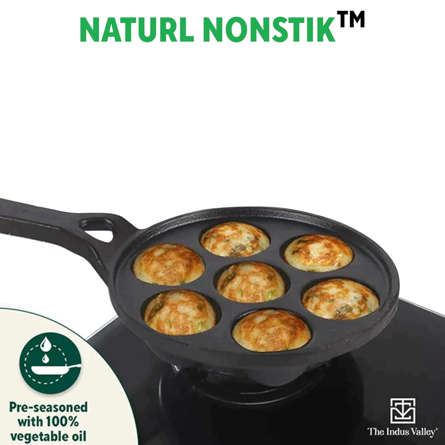 Pre-seasoned Black Cast Iron Paniyaram Pan With Free Wooden Picker | 7 Pits, 21cm, 8.3 Inch, 1.7 Kg | Induction Friendly | Pre-seasoned Paddu Pan, 100% Pure & Toxin-free, No Chemical Coating