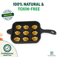 Toxin free cookware: Made from 100% Natural cast iron cookware, this cast iron paniyaram pan is a 100% Healthy cookware, food safe without chemicals, coatings or toxins