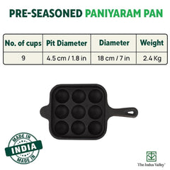 Pre-seasoned Black Square Cast Iron Paniyaram Pan With Long Handle | 9 Pits, 18cm, 7 Inch, 2.4 Kg | Induction Friendly | Pre-seasoned Paddu Pan, 100% Pure & Toxin-free, No Chemical Coating