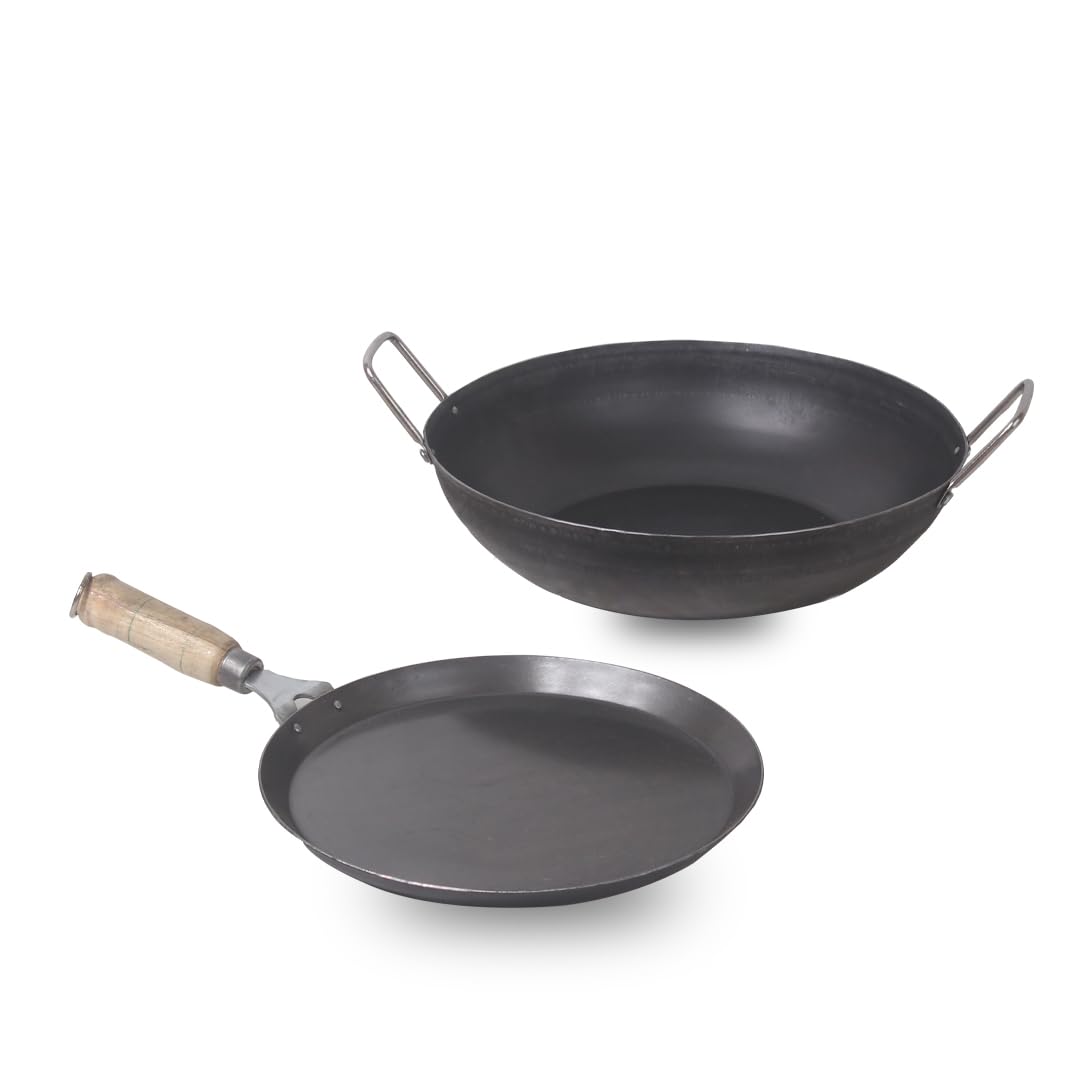 Pre-seasoned Iron Cookware Set | Kadai 24.6 Cm, 2.7 Liters + Tawa 26 Cm | Kitchen Cooking Combo Pots & Pans Set Of 2 Pcs | Naturally Nonstick