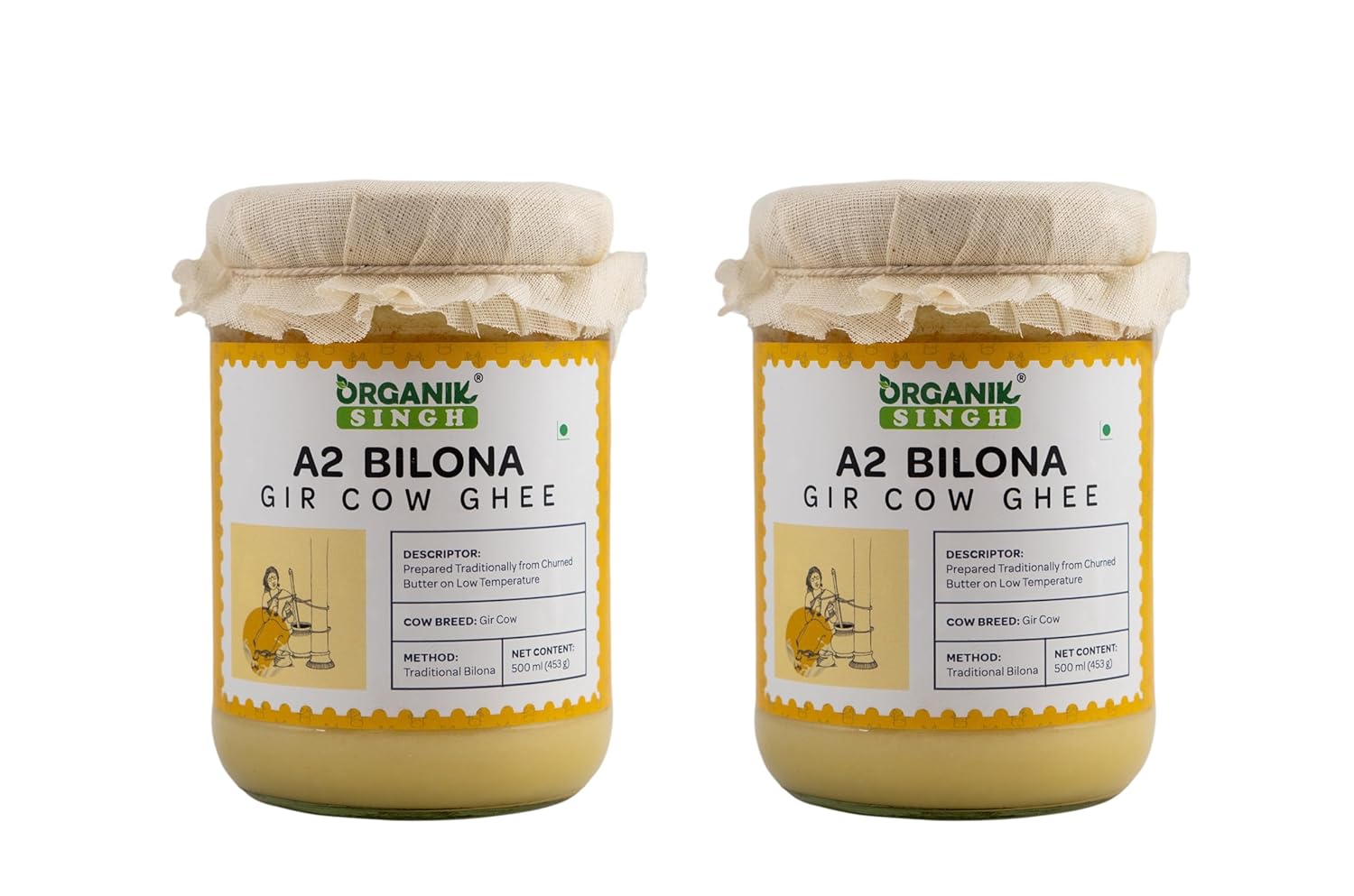 Premium A2 Bilona Desi Gir Cow Ghee By Organik Singh | Great Source Of Energy & Vitamin Healthy Desi Ghee | 1 Litre (500ml * 2) 33.8 Ounce | Glass Jar