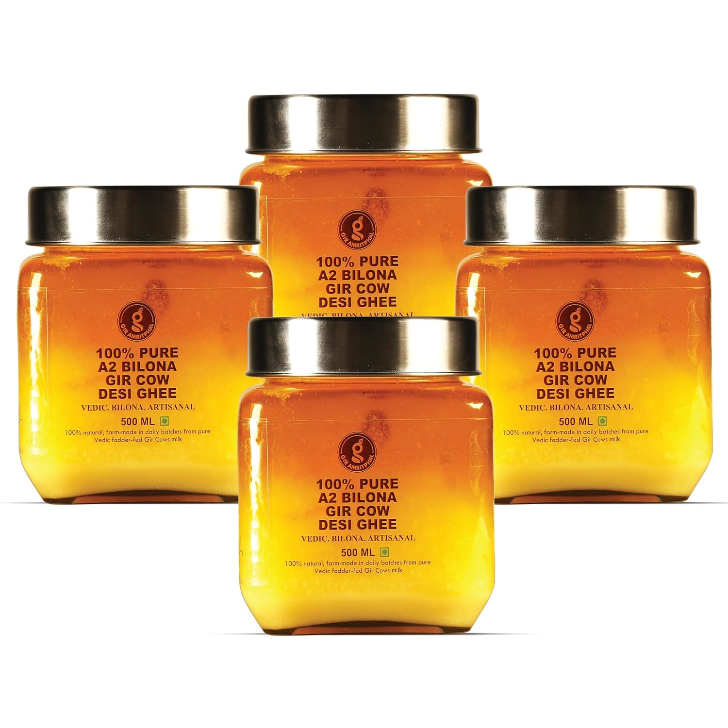 Premium A2 Bilona Gir Cow Desi Ghee By Gir Amritphal | Good Source Of Healthy Desi Cow Ghee For Bakes Cookies | 2litre (500ml * 4) 67.6 Ounce | Container Jar