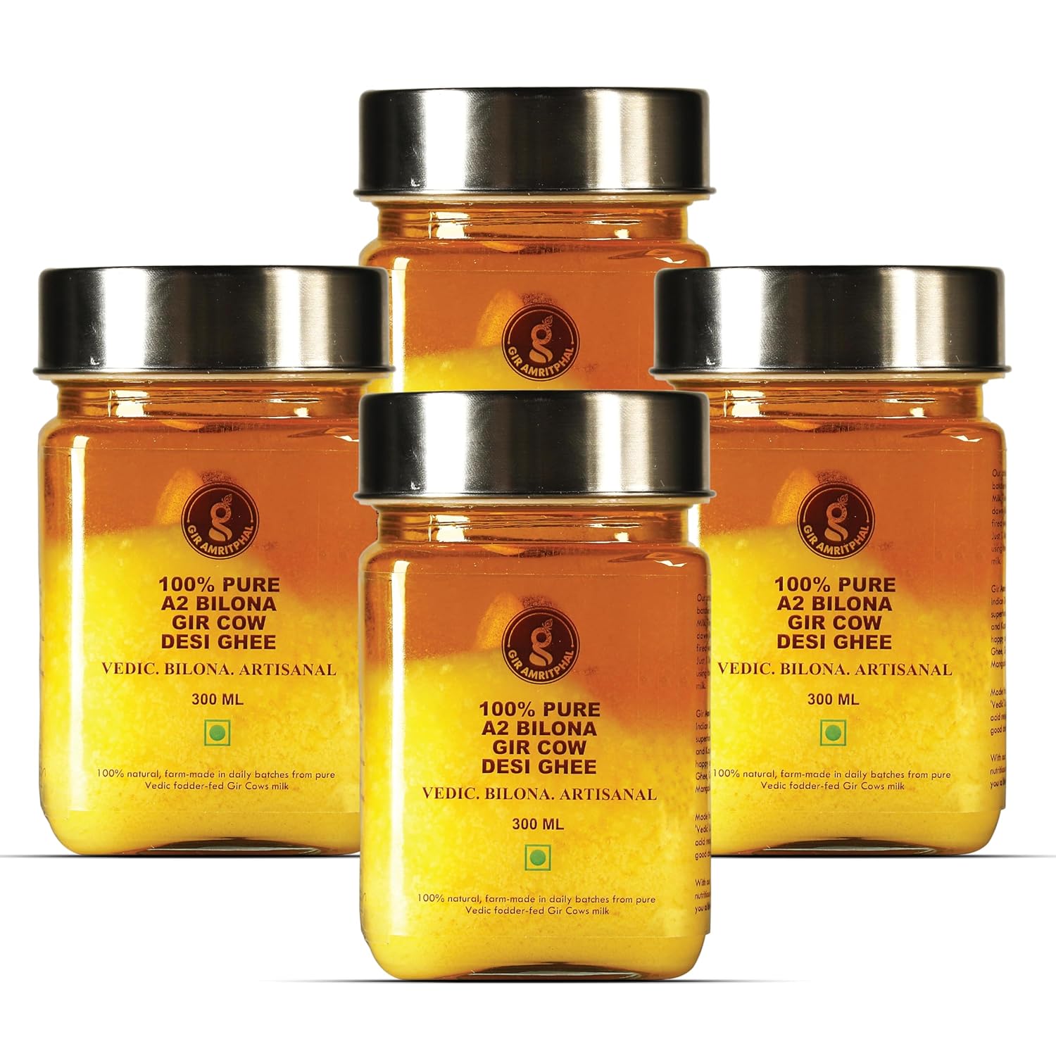 Pure Gir Cow A2 Desi Ghee. Gir Amritphal Desi Ghee Is Organic, Nutritious, And Pure. It Is Crafted In Small Batches With 100% A2 Gir Cow Milk. Native Gir Cows Are Known For Producing High-Quality A2 Milk. Unlike Regular Milk, A2 Milk Contains Protein Which Is Nutritious And Safer Than Milk With A1 Protein.