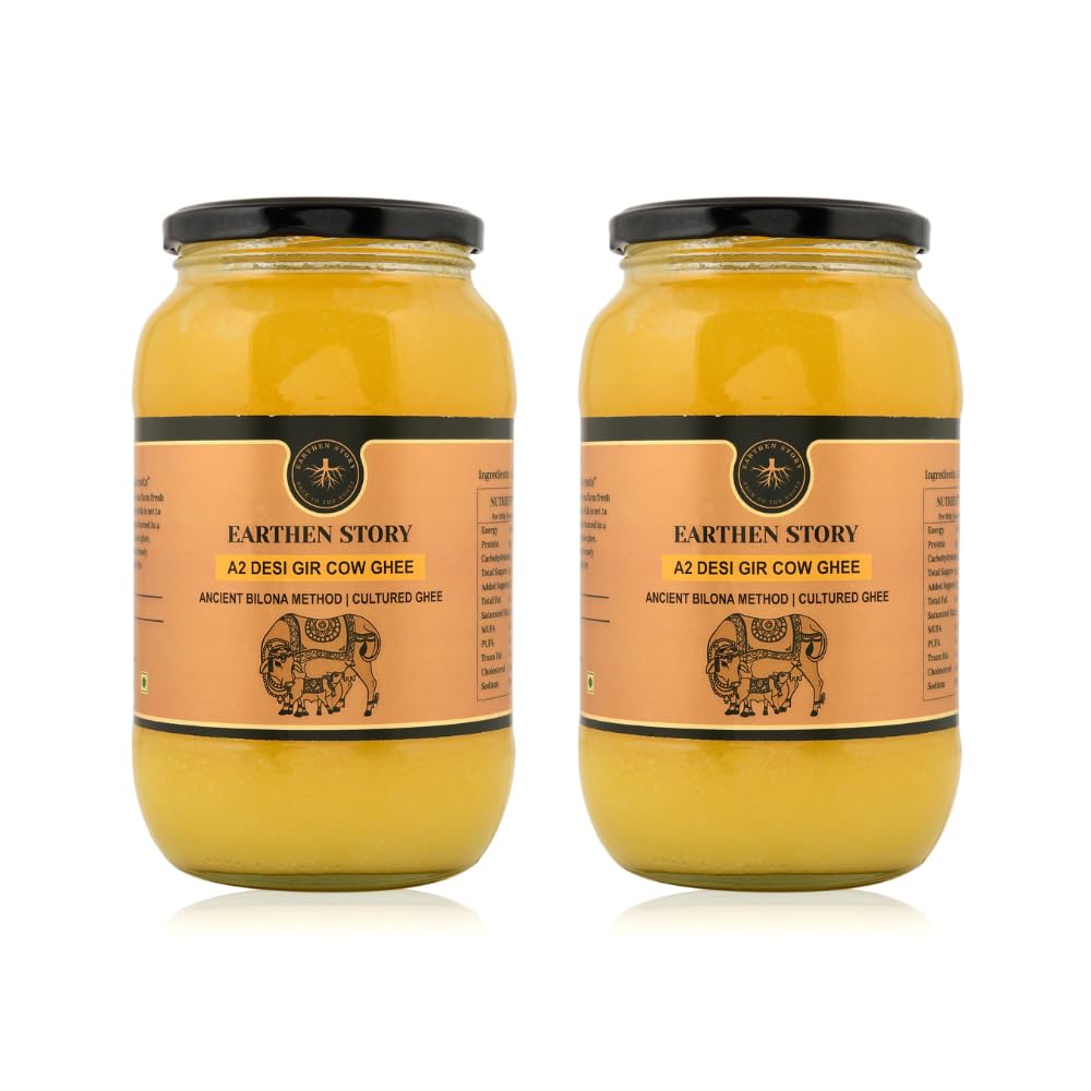 Earthen Story A2 Desi Gir Ghee Is 100% Pure, Preservative-Free, Chemical-Free, And Cruelty-Free.Farm Fresh A2 Milk From Desi Gir Cows Is Boiled And Set To Curd, Then The Curd Is Slowly Hand Churned Bi-Directionally In A Wooden Churner Called A Bilona Which Gives Our A2 Cow Ghee Its Own Rich Consistency,Golden Grain Texture, Nutty Aroma And Great Flavour.