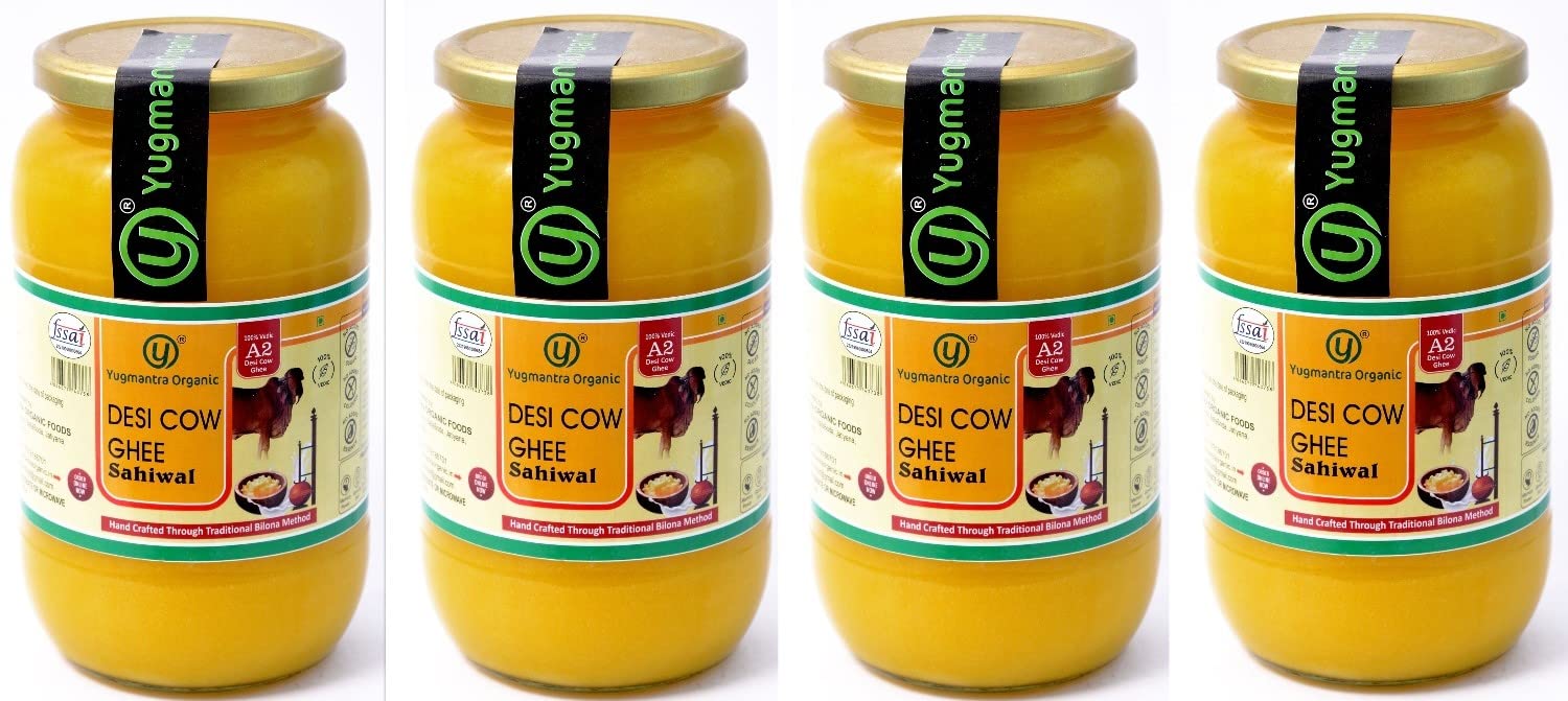 Premium A2 Danedar Desi Sahiwal Cow Ghee By Yugmantra Organic Foods | Rich In Nutrients Healthy & Protein Fiber Desi Ghee Perfect For Bones Health | 4ltr (1 Ltr * 4) 135.2 Ounce | Jar Pack