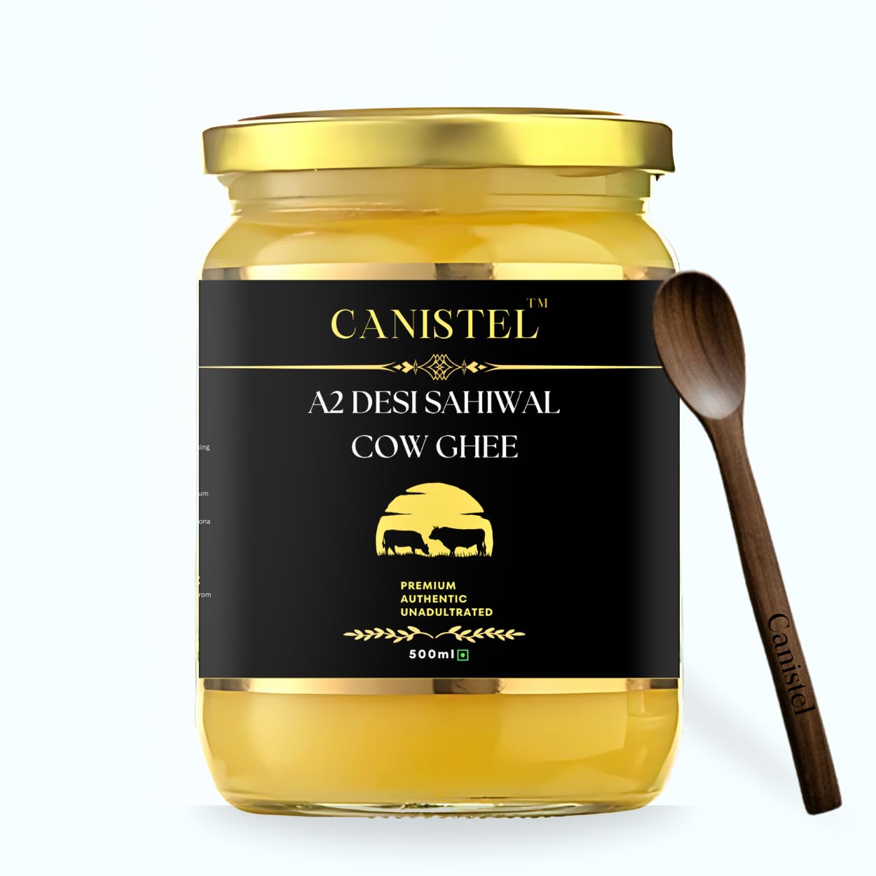 Premium A2 Desi Sahiwal Cow Ghee By Canistel | Traditionally Hand Churned With Bilona Method Healthy Pure Desi Ghee For Body Joint Pain | (500ml) 16.9 Ounce | Glass Jar
