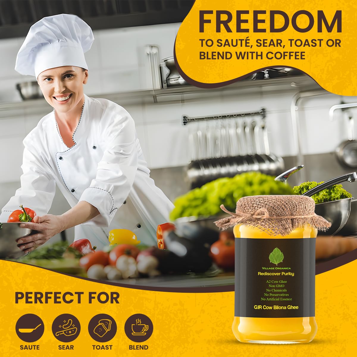 Premium A2 Gir Cow Ghee By Village Organica | Good Source Of Healthy Desi Cow Ghee Perfect For Body Joint Pain | (1 Litr) 33.8 Ounce | Jar Pack
