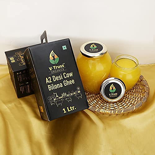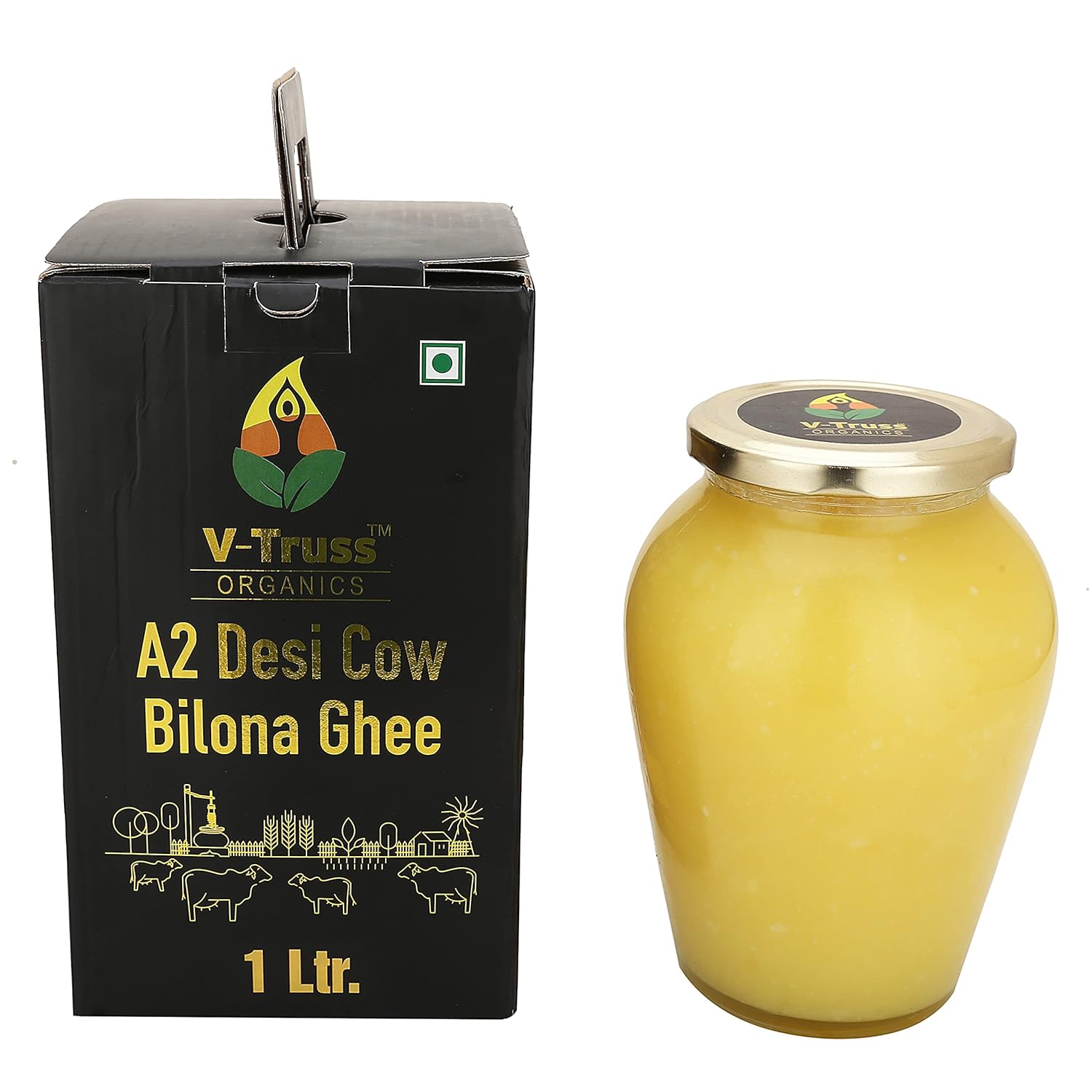 Premium A2 Pure Desi Cow Bilona Ghee By V - Truss Organics | Traditional Vedic Bilona Method Healthy Desi Cow Ghee Perfect For Boost Immunity | (1 Litre) 33.8 Ounce | Jar Pack