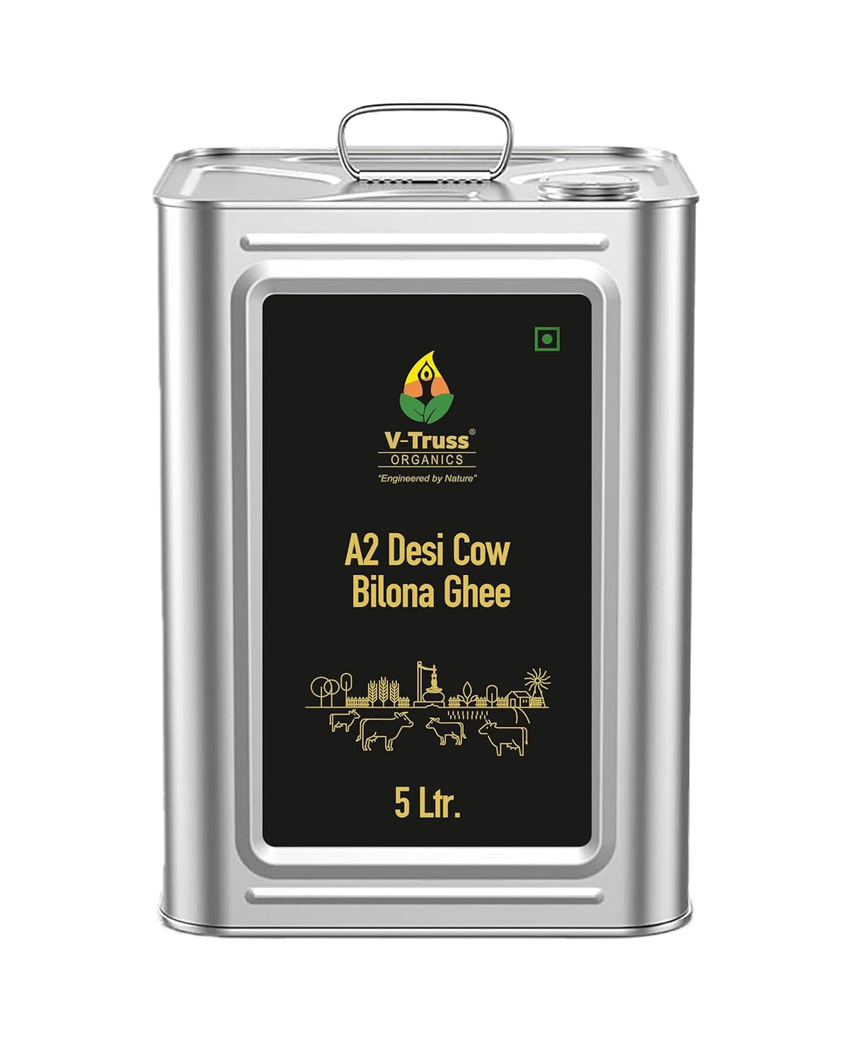 Premium A2 Pure Desi Cow Bilona Ghee By V - Truss Organics | Traditional Vedic Bilona Method Healthy Desi Cow Ghee Perfect For Cooking & Sweets | (5 Litre) 169.0 Ounce | Tin Pack