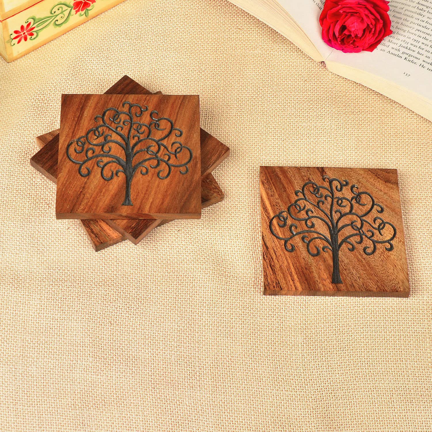 Engraved with hand on seasoned Sheesham Wood , this Coaster Set is a great addition to your tableware.