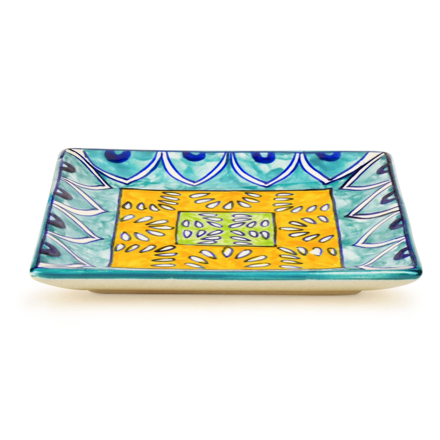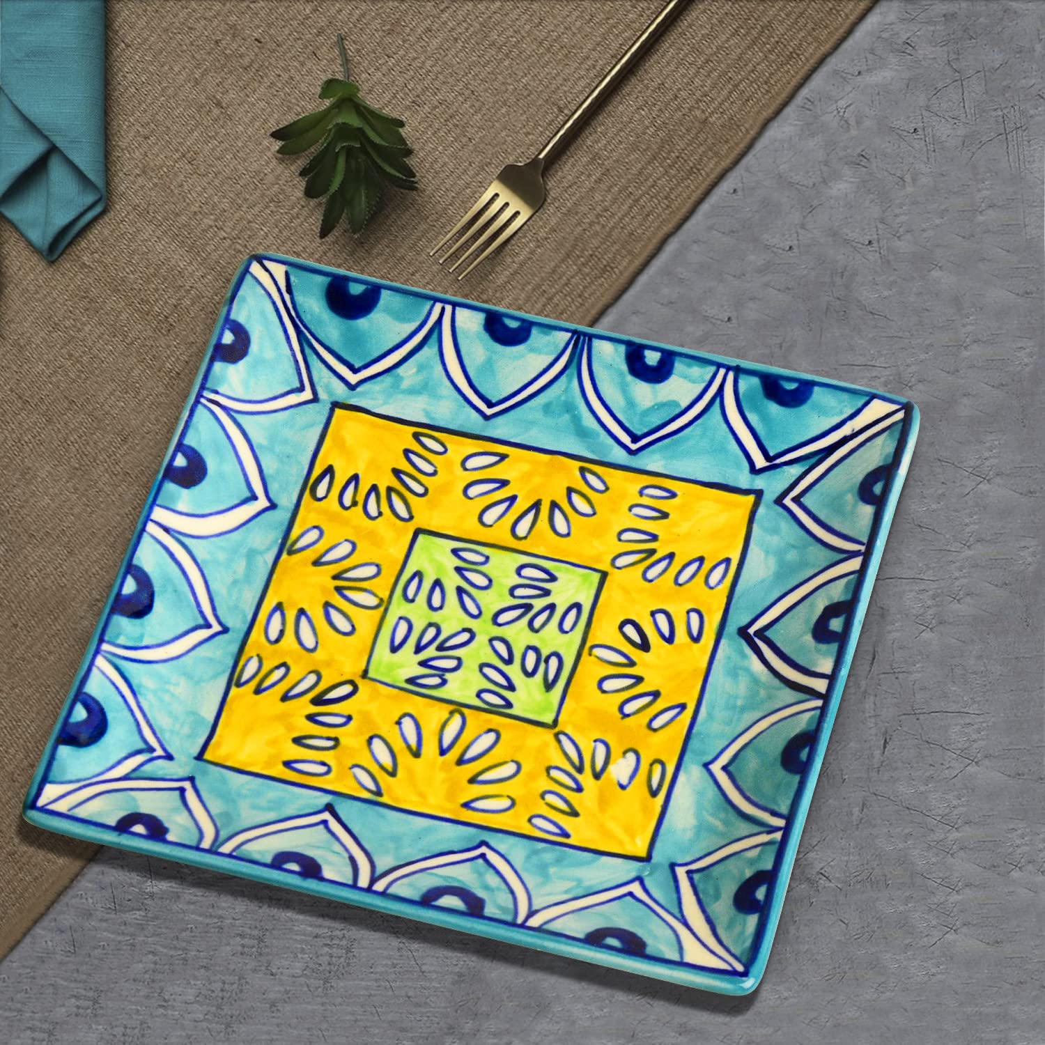 Premium Hand Painted In Traditional Design Ceramic Square Platter - Blue & Yellow, L X B – 18 Cm X 18 Cm | Starter Serving Tray