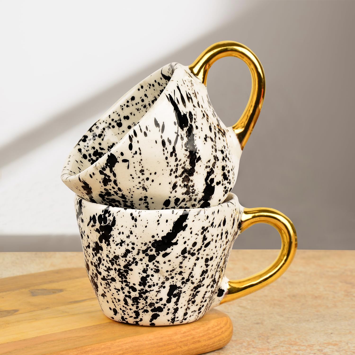 Premium Handmade Dalmation Ceramic Coffee Mugs With Golden Handle Set Of 2 - 200ml, White & Black | Tea Cups & Mugs | Chai Cups