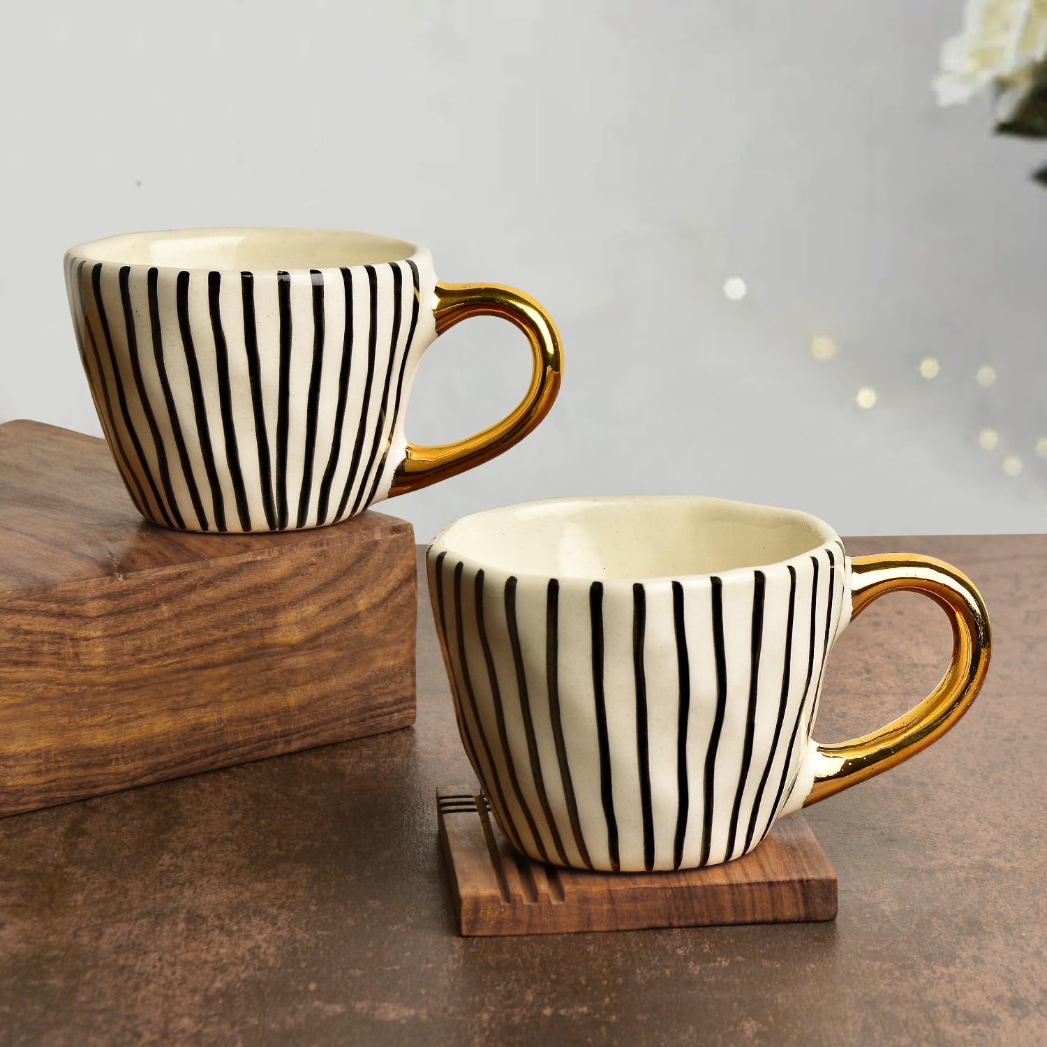 Premium Handmade Vertical Stripes Ceramic Coffee Mugs With Golden Handle Set Of 2 - 200ml, Black & White | Tea Cups & Mugs | Chai Cups