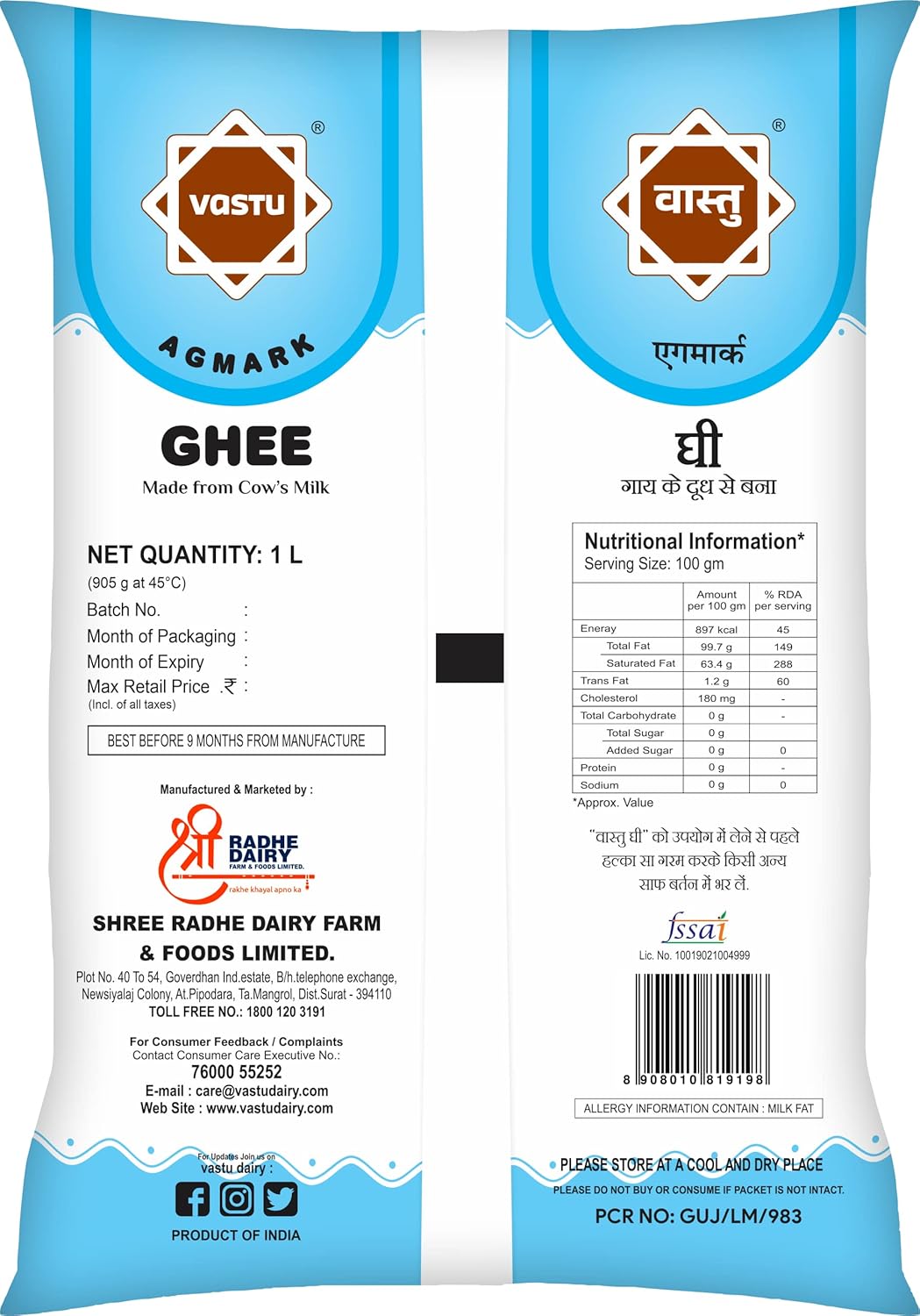 Premium Natural Agmark Desi Ghee By Vastu Ghee | High In Protein Fiber Healthy Desi Pure Ghee Good For Weight Loss | (1 Litr) 33.8 Ounce | Pouch Pack