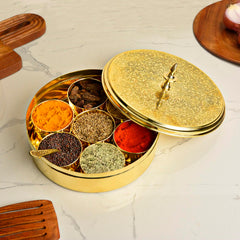 Premium Pure Brass Floral Etched Indian Spice Box For Kitchen With Spoon - 7 Containers, 120ml Each, Golden Color | Diameter - 8 Inches, Weight - 960gm | Peetal Masala Dani, Masala Dabba
