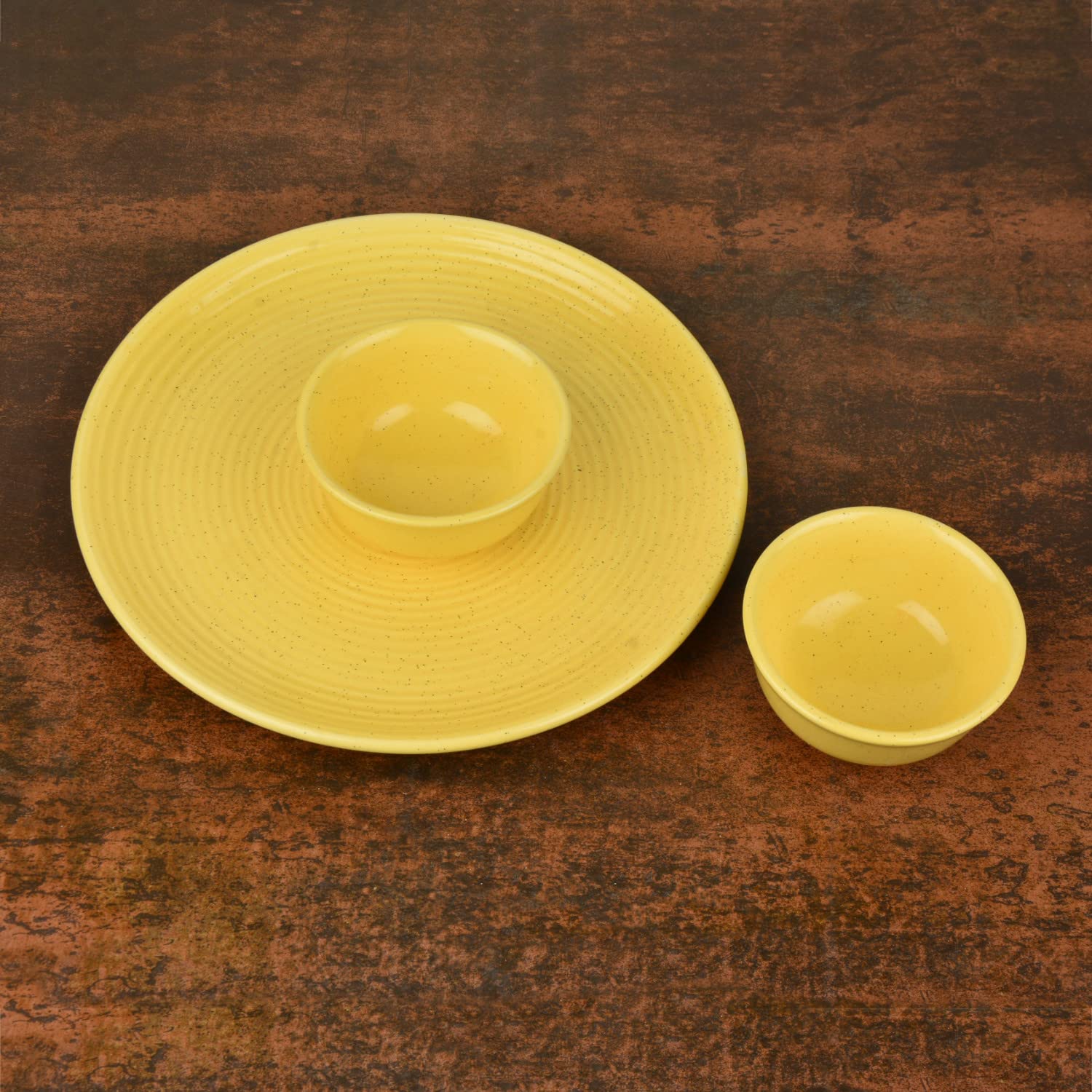Premium Ribbed Ceramic Dinner Serving Plate With 2 Dinner Bowls Set Of 3 - Yellow, Plate Diameter: 10 Inches | Plates & Bowls Set - Golden Glow Collection