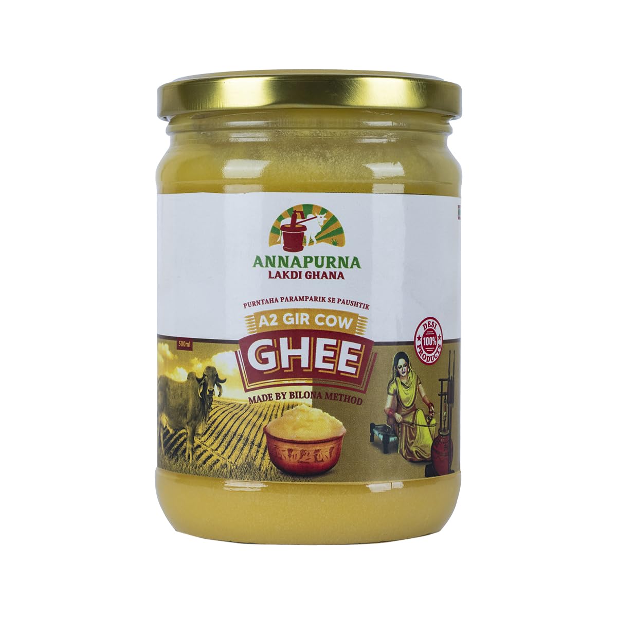 Pure A2 Desi Ghee By Annapurna Lakdi Ghana | High In Protein Fiber & Nutrients Healthy Desi Ghee Good For Parathe | (500ml) 16.9 Ounce | Jar Pack