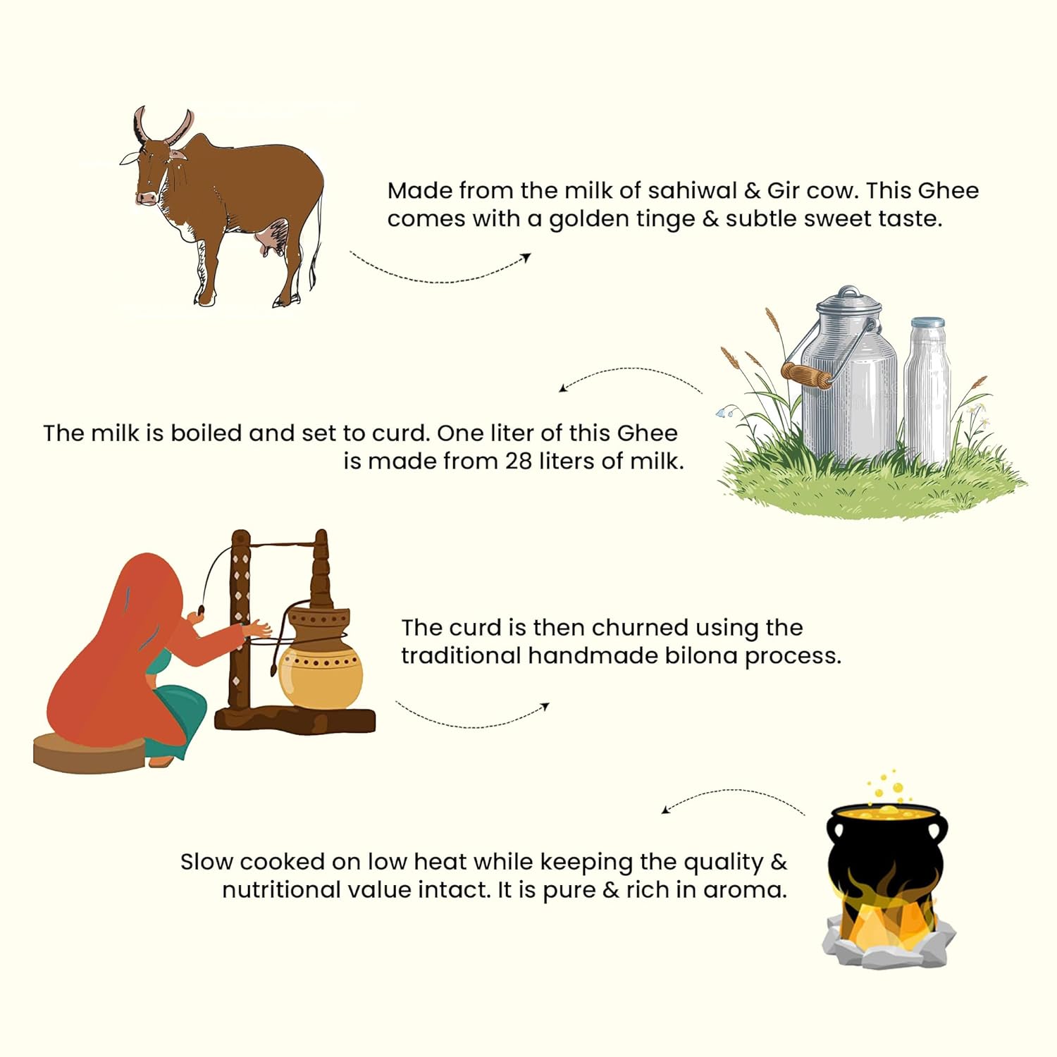 Traditional Bilona Method - This Pure A2 Desi Cow Ghee Is Made In The Traditional Bilona Method, In Which Whole A2 Milk Is Used To Make Curd, And Then The Curd And Butter Are Churned And Slowly Heated To Produce Ghee