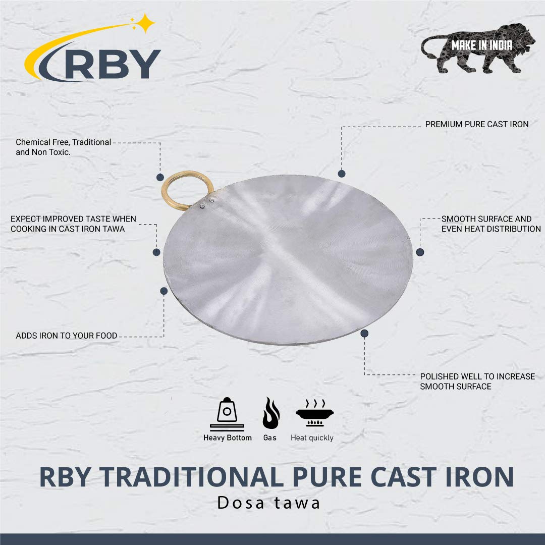 Use & Care - All The RBY iron products are completely hand seasoned. But it needs cleaning and seasoning for few times before cooking. Once you received your tawa, clean it completely using mild dish-washing liquid and water. After cleaning, wipe it using a soft cloth and let it dry. Then, apply cooking oil all over it. Heat your tawa under medium flame for 20 mins. After 20 mins, switch it off and let it cool down completely.