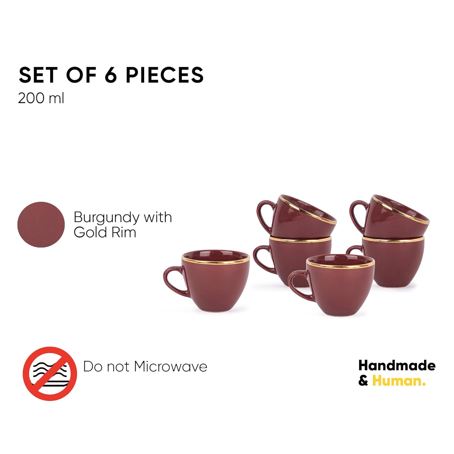 Real Gold Line Ceramic Tea Cups Set Of 6 - Burgundy Gold Line, 200ml Each | Tea Cup Set Of 6 | Premium Ceramic Tea Set With Glossy Finish | Ceramic Tea Cup